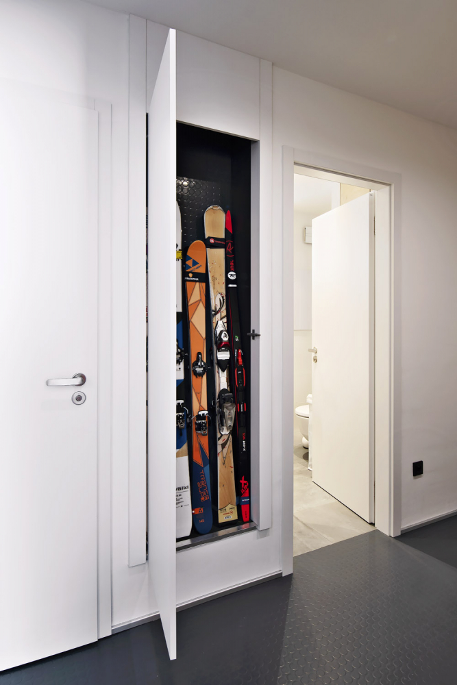 Celá rodina hodně lyžuje, takže architektka vytvořila v předsíni speciální niku, do které se mohou ukládat i mokré lyže.