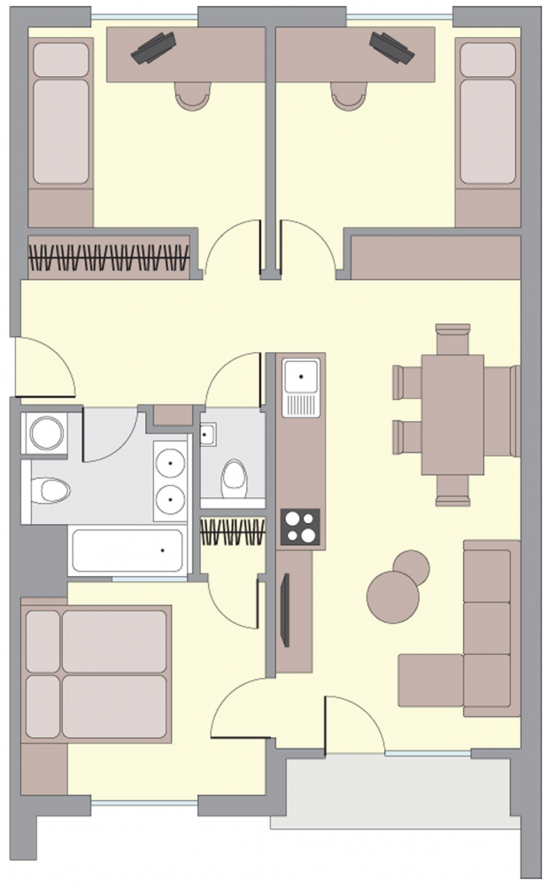 Nejprve bylo tedy potřeba změnit původní nevyhovující dispozici, kde byly dva pokoje, jeden obývací pokoj a malá kuchyňka, velká chodba, malá koupelna a oddělené WC. Aby bylo možné přidat pokoj navíc, bylo nutné zásadně změnit dispozici, a to tak, že se upravovaly i nosné zdi. U sportovní rodiny bylo také zásadní vyřešit úložné prostory.
