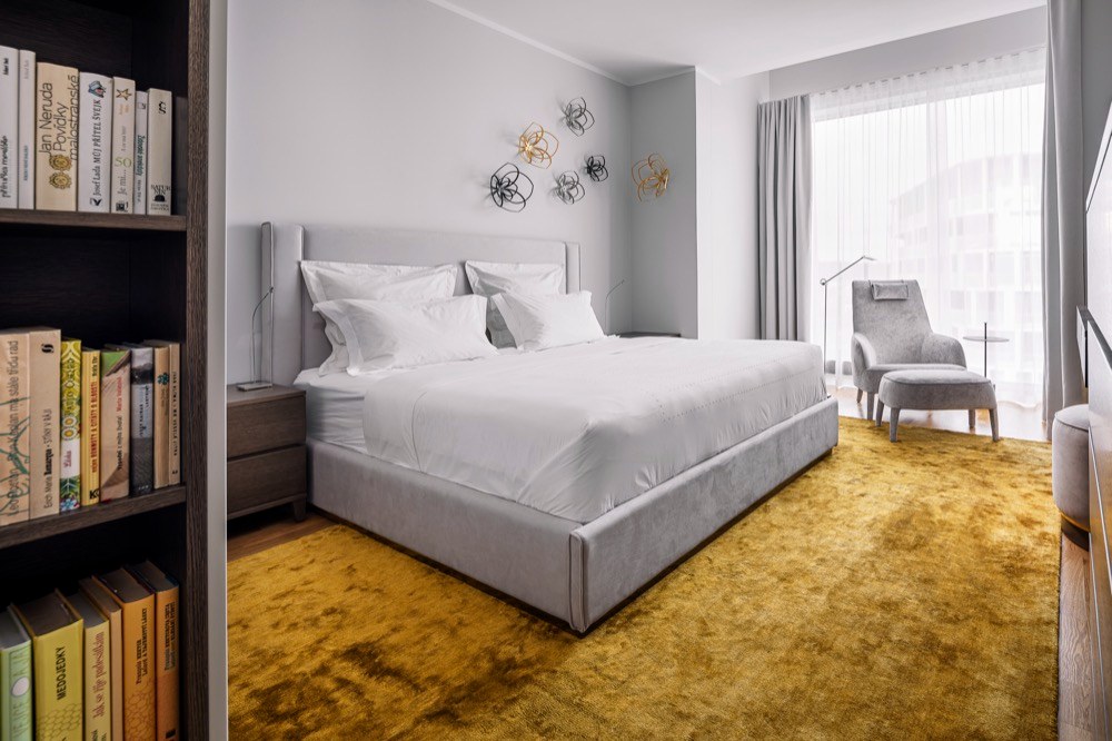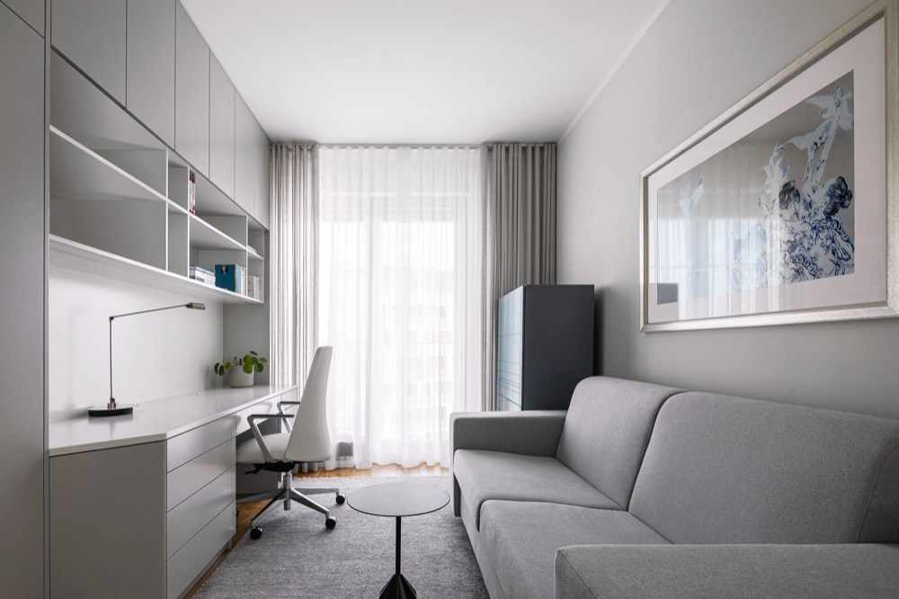 Hlavní obytný prostor tvoří obývací pokoj spojený s kuchyní a jídelnou. Velká okna přinášejí do místnosti dostatečné množství přirozeného denního světla. Kuchyňská linka zabírá kratší stěnu obývacího prostoru a pracovní plocha je rozšířena o plochu ostrůvku, který zároveň opticky odděluje kuchyňskou část od té obývací. Kuchyňská pracovní deska a také obklad za pracovní deskou je z materiálu -TechniStone v dekoru mramoru Crystal Calacatta Silva. Na ostrůvek navazuje na míru navržený a vyrobený jídelní stůl. Ložnice je laděná v tmavém dekoru dubu v kombinaci s pískovým odstínem textilií a výrazným zlatým kobercem. Ve vstupní části ložnice jsou umístěny vestavné skříně ve tvaru L, které nahrazují nedostatek úložných prostor a zároveň oddělují odpočinkovou část od vstupu do koupelny. Čelní část těchto skříní tvoří knihovna, která vizuálně zmenšuje hmotu nábytkového bloku a současně plní požadavek majitelky na dostatek místa pro knihy. Místnost nakonec doplňují nástěnné umělecké plastiky od výtvarnice Christine Habermann von Hoch. Oba menší pokoje – ložnice a pracovna – mají velmi jemné barevné schéma, díky kterému působí větším a vzdušnějším dojmem. Pracovna je navržena jako prostor příjemný pro práci, poslech hudby či odpočinek a zároveň může plnit i funkci hostinského pokoje. Světlé barevné ladění druhé ložnice dává prostor vyniknout obrazu Leading Lady od Amy Stone.