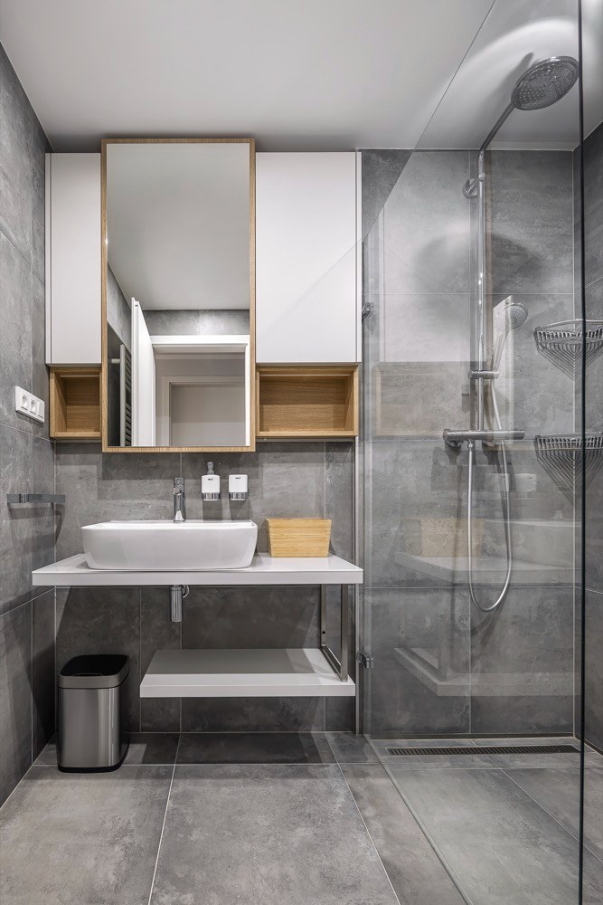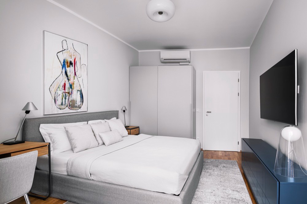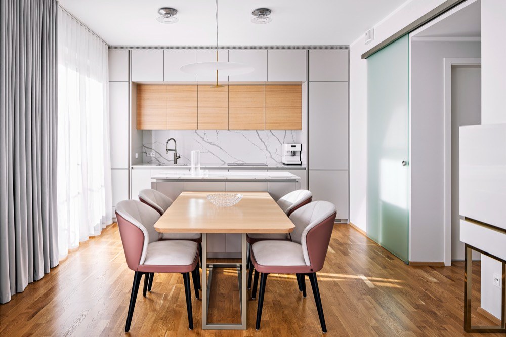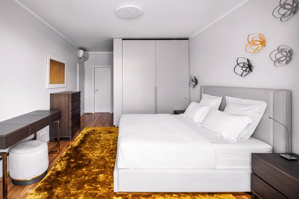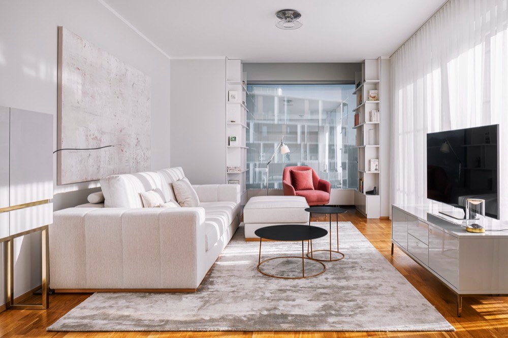 Dojem z celého prostoru, kterého chtěly designérky dosáhnout, by se dal popsat slovy jako křehkost, ženskost a elegance. Jako barevný koncept zvolily tlumenou paletu barev, neutrální tónované odstíny bílé, šedé, modré a šedobéžové a zlatou v ložnici v kombinaci s majitelčinou oblíbenou pudrově růžovou v obývacím prostoru. Skříně a další úložné prostory jsou vyrobeny v elegantních odstínech šedé, v některých prostorách v kombinaci s dekorem přírodního nebo tmavého dubu. Při výběru svítidel kladly důraz na kvalitu a čisté tvarové linie. Všechna svítidla pořídily od prestižních značek, jako je Lumina, Serien nebo Artemide. Společně s vysoce kvalitními materiály ve výsledku docílily moderního a elegantního designu s nádechem luxusu. Zajímavým prvkem bytu jsou výklenky v obývacím pokoji a ložnici, jejichž čelní stěna je téměř celá prosklená. Společně se značnou výškou, ve které se byt nachází, to nabízí krásné výhledy, a tedy i jedinečný prostor pro relaxaci. Toho designérky využily a do těchto výklenků umístily pohodlná křesla.