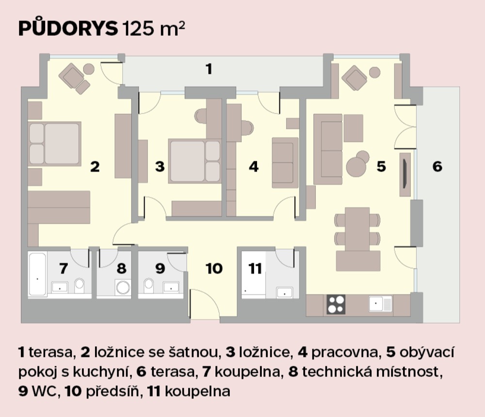 Byt o rozloze 125 m2 se nachází v novostavbě pražského luxusního projektu Zahálka přímo u břehu Vltavy a golfového hřiště Hodkovičky. Dispozice 4+kk zahrnuje předsíň, obývací pokoj, jehož součástí je i kuchyň s jídelnou, dvě ložnice, pracovnu, dvě koupelny, samostatnou toaletu a terasy na jižní a západní straně bytu.