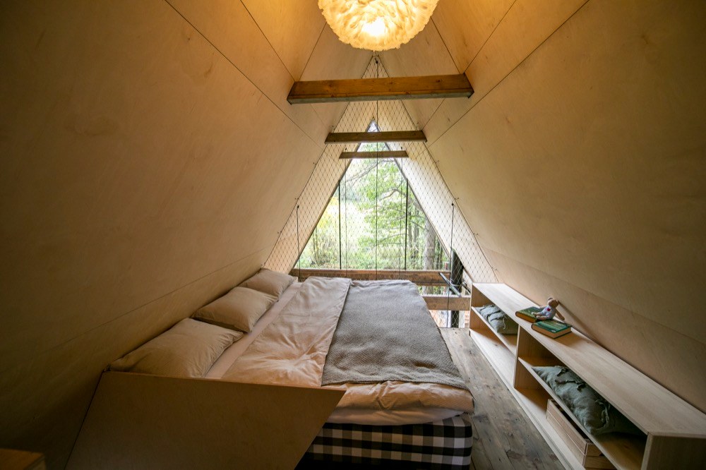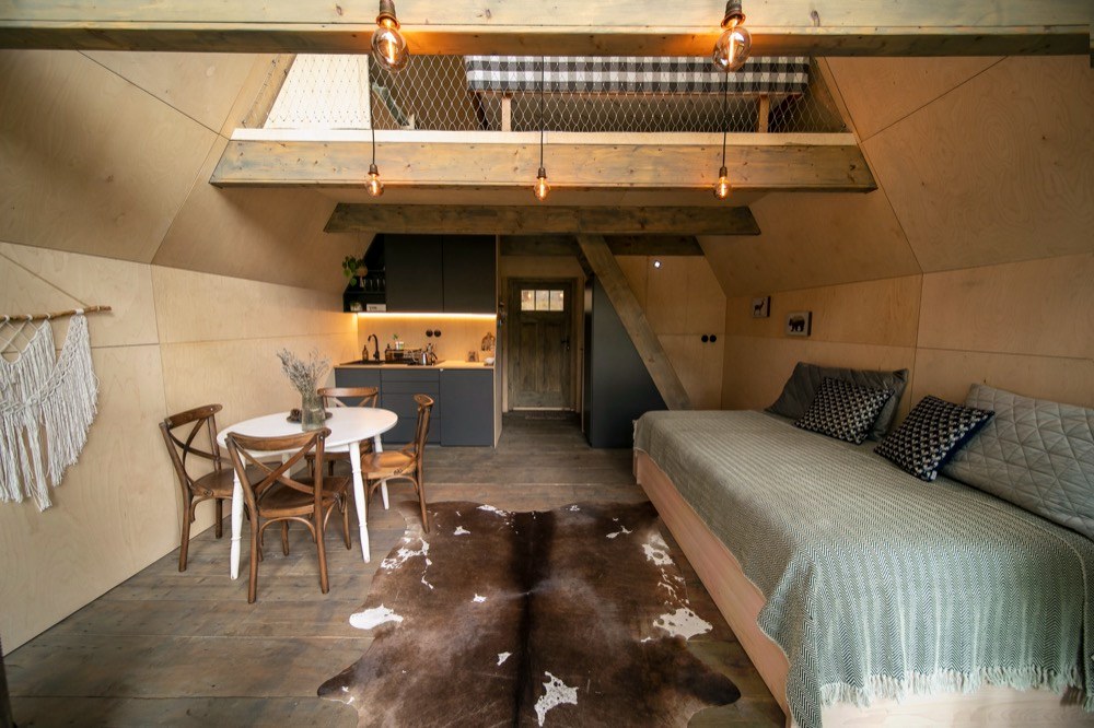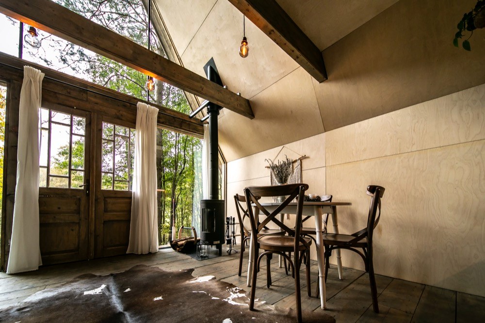 S ideovou studií pomáhali majitelům architekti z Ateliéru HRA, vlastní interiér už si designovali sami. Aby si návštěvníci užili co nejvíce lesa, v němž je chatka posazená, a -interiér dokonale splynul s přírodou, nechali majitelé celý štít prosklít a stěny uvnitř obložili březovou překližkou. Přízemí zařídili starým restaurovaným nábytkem a novými židlemi ve venkovském stylu s patinou. Atmosféru utváří i podlaha poskládaná ze 150 let starých renovovaných prken. Hezkou kulisou jsou zde staré opravené dvoukřídlé dveře, které jsou včleněny do proskleného štítu. O teplo se v chatě starají elektrické přímotopy, další teplo a romantiku dodávají krbová kamna. Malá kuchyň vyrobená truhlářem se sice tváří moderně, ale stylově ji doplňují keramické zásuvky. Ložnice je umístěna na dřevěném patře a nabízí pohodlné poležení na kvalitních postelích značky Hästens. Tento prostor pro odpočinek nápaditě odděluje rybářská síť.