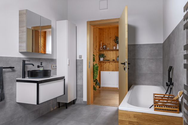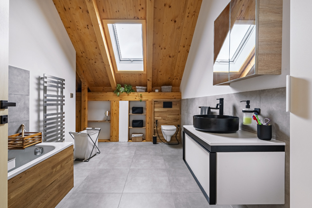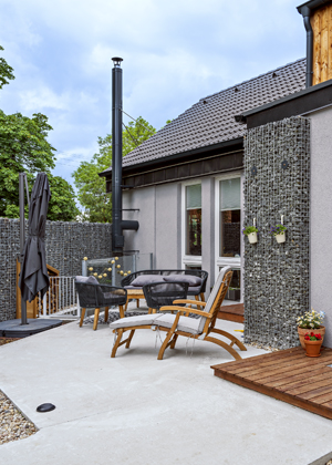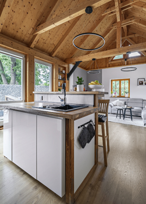 Část domu s původní zdí a otevřeným krovem je celá vyčleněná pro hlavní obytný prostor s obývákem, kuchyní a jídelnou. Velká okna spolu s francouzskými dveřmi prostor prosvětlují a přirozeně ho propojují s terasou s venkovním posezením a zahradou. Katka se Zdeňkem si otevřený dřevěný krov velmi pochvalují, protože místnost působí vzdušně a velmi útulně, a jsou moc rádi, že do toho dědovi nezasahovali. Sami by si možná tuto variantu z důvodu možných úložných prostor na půdě nevybrali. Díky dědovu nápadu tak můžou obdivovat atmosféru dřeva a užívat si pocitu, že netráví čas zavření v nějakém stísněném prostoru.