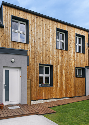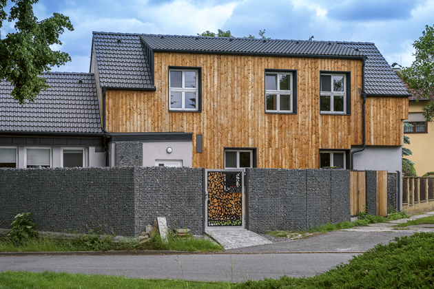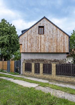 Málokomu se poštěstí, že má hodného a šikovného dědečka, který postaví krásný dům pro svá vnoučata. Dva malí kluci si to zatím ještě neuvědomují, zato jejich rodiče Katka a Zdeněk jsou z dárku nadšení. Ač do stavby a zařizování vůbec nezasahovali, díky dědovu fortelu a vkusu je dům naprosto dokonalý a dle ročních zkušeností se v něm žije fantasticky celé rodině. Začalo to tak, že děda koupil starý dům s malým nevyhovujícím půdorysem, ale s myšlenkou, že stojí na hezkém pozemku a určitě půjde zrekonstruovat. Nakonec ze stoletého stavení zachoval jen jednu silnou kamennou zeď a sklep. Na původních základech postavil část domu a k ní přistavěl další větší polovinu domu. Děda je bývalý dřevorubec a doteď staví dřevěné domy, volba na typ stavby byla tedy jasná – půjde o dřevostavbu a bude to dům, který bude přesně odpovídat jeho představám. Jako firmu, která se stavby ujme, zvolil Dřevostavby TMEJ, s níž spolupracuje. Dřevostavba má konstrukci z masivního dřeva, trámy jsou ze smrkových BSH hranolů, na záklop byla použitá biodeska, fasádu tvoří modřín.