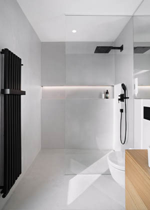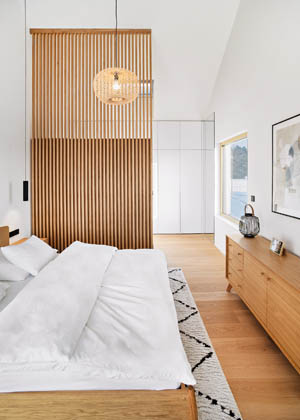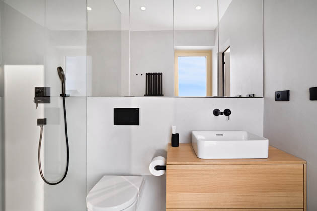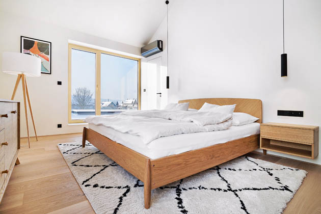 Foto: Filip Györe Po vystoupání do patra nelze přehlédnout chytře zabudované šatní skříně lemující celou stěnu. Navržené řešení šetří hlavně prostor. Po levé straně vede souběžně se schodištěm chodba, z které jsou přístupné dva dětské pokoje. Napravo od schodiště je koupelna určená pro děti a dále pak ložnice. Ta je prosvětlená, útulná a minimalistická. Nelimituje ji klasický strop, ale otevírá se do krovu. U ložnice je koupelna majitelů s podlahou i stěnami pokrytými světle šedou voděodolnou stěrkou.