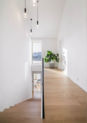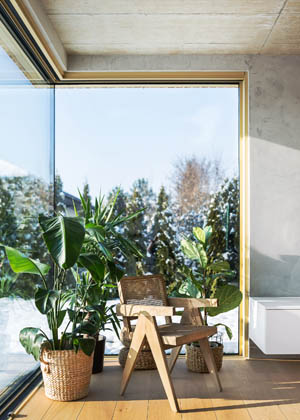 Ostatní stěny jsou vystavěny z klasických cihel také tloušťky 300 mm s vnější tepelnou izolací tloušťky 150 mm. Uchováním kýženého prostoru a naplánováním kryté dvojgaráže bylo splněno základní zadání na zasazení stavby na pozemek. I zahrada získala potřebnou velikost například pro budoucí bazén či prolézací dětské hřiště. Celek pohledově doplňují velkoformátová hliníková okna, symbolizující oči do duše rodiny, která jsou navržena v hnědém odstínu souznícím s dřevěným obkladem fasády. Vzhled exteriéru ladí s interiérem. Bílé stěny navazují na strop domu z železobetonu s viditelným obtiskem bednění. Dřevěné tóny zde byly použity na podlahy a nábytek.