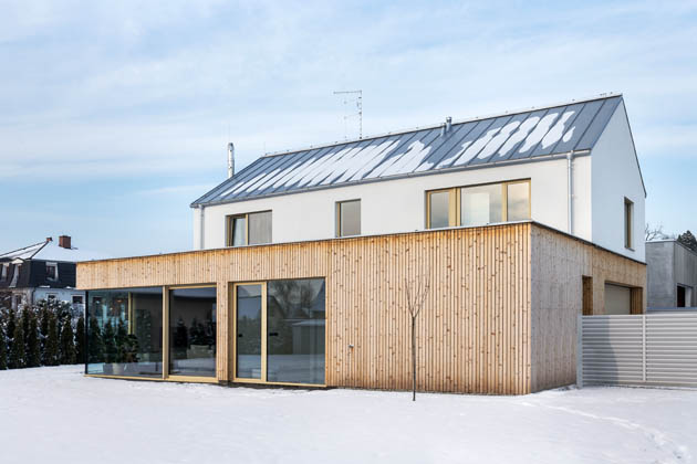 Vzhled domu pak odráží ověřené materiálové propojení dřeva, betonu i železa. Dominantní je prolnutí dvou hmot, kde plochá střecha nad dřevěným obkladem navazuje na druhou část domu s klasickou sedlovou střechou, doplněnou falcovaným plechem. U sedlové střechy trvali tvůrci na tom, aby její samotné provedení bylo bez přesahů, což bývalo v minulosti zvykem. A právě tímto řešením stavba už na první pohled vytváří dojem tradičního českého domu.