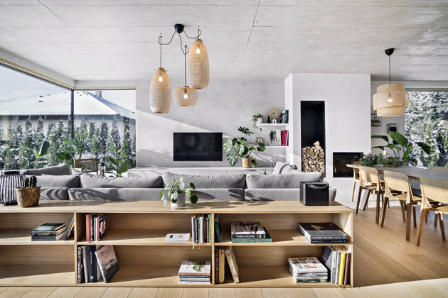 S překročením pomyslného prahu se umocňuje pocit útulného interiéru. Uprostřed obývací části se nachází sedací souprava do tvaru písmene U v šedé barvě. Obývací prostor a kuchyň rozděluje velký jídelní stůl pro osm osob s přímým pohledem na zabudovaný krb.