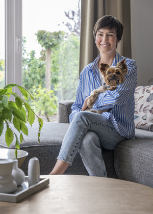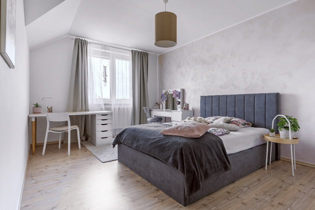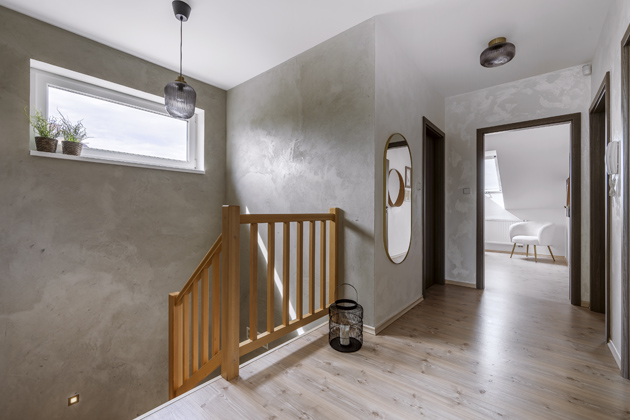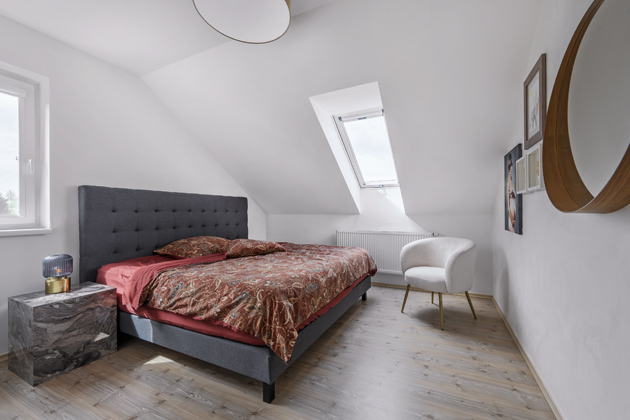 Od stolu je to jen kousek na rohovou sedačku a k houpacímu kokonu, kde tráví rodina další společné chvíle. Jak z jídelny, tak z obýváku vedou prosklené dveře na zahradu, která dodává interiéru hezkou zelenou kulisu. Celý tento prostor ozvláštňuje stěrka na části stěn. Její autorkou je sama paní domu, která se nebojí ani takovýchto výzev. Stěrka pokrývá i stěny v chodbě, ale o tu se postaral odborník, neboť by to ve výšce kolem schodiště bylo pro ženu komplikované a náročné. Stejně tak jako stěrka je dalším pojícím prvkem celého domu laminátová podlaha v dřevěném dekoru. V patře je dětský pokoj dcery Viktorky, pro kterou je zásadní toaletní stolek a drobnosti, které vystihují čtrnáctiletou slečnu. Vedlejší pokoj jedenáctiletého syna Maxe nezapře mladého hokejistu. Ložnici rodičů dominuje kontinentální čalouněné lůžko od firmy ProSpánek.