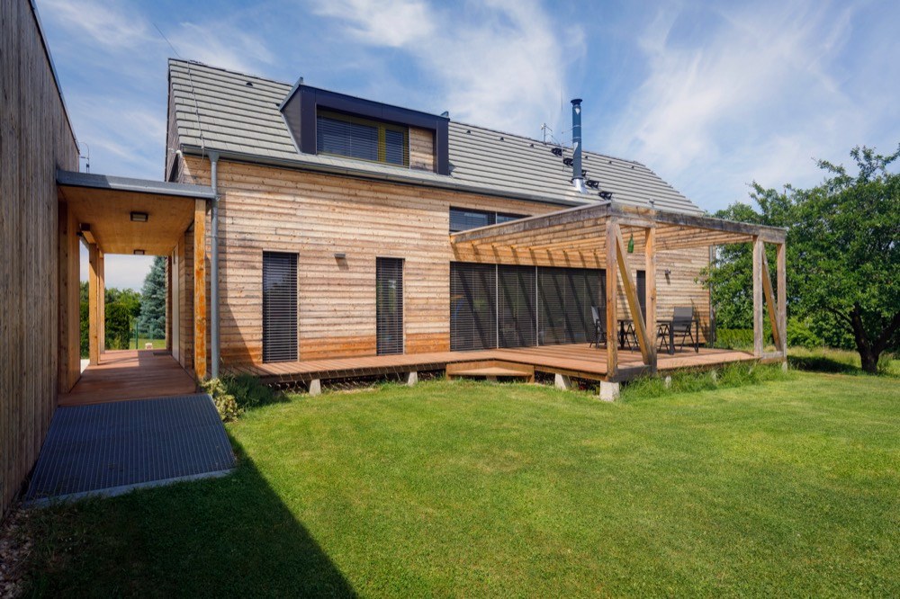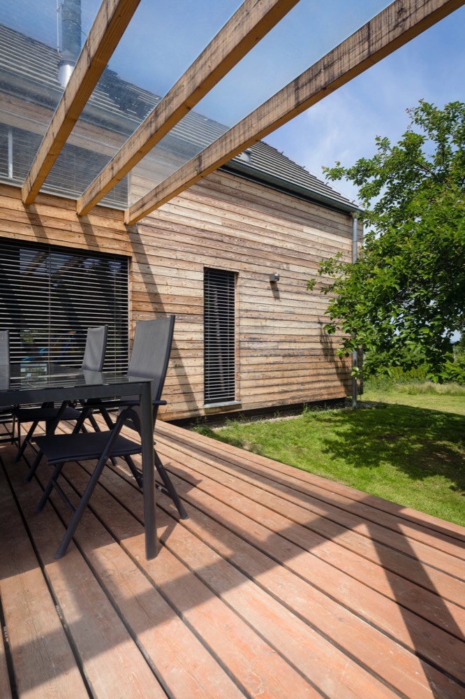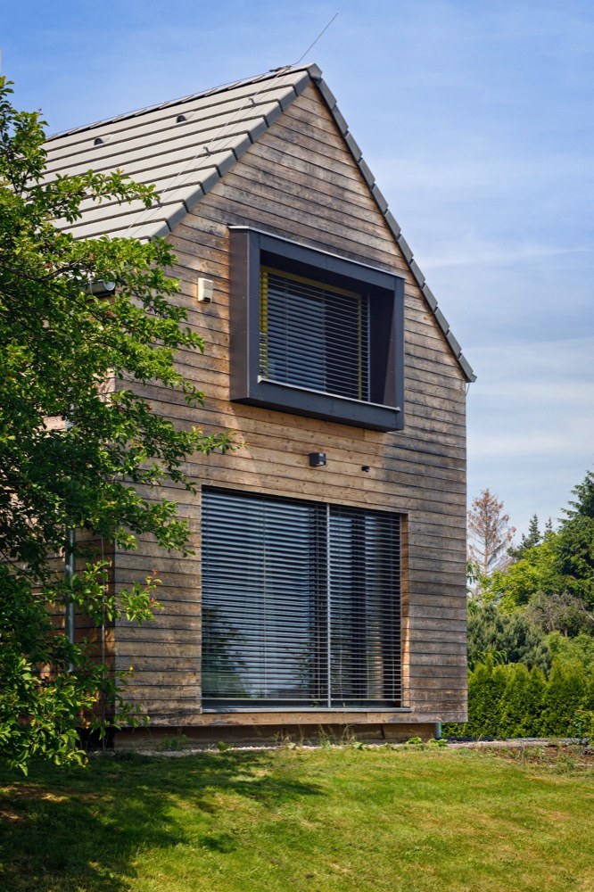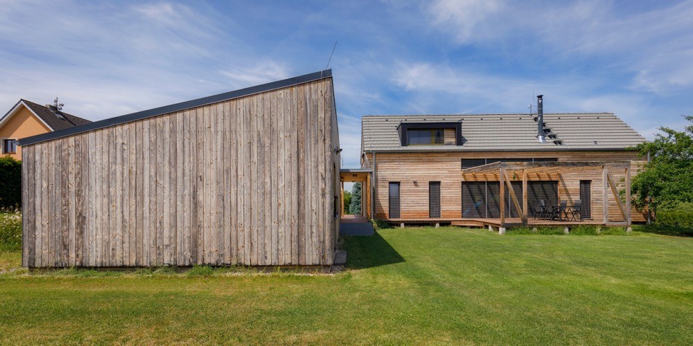 Nepodsklepený dvoupodlažní dům má klasickou sedlovou střechu se zvýrazněnými vikýři, prosvětlujícími obytné podkroví. Na střeše je položená skládaná šedá střešní krytina. Vikýře oken jsou pokryté falcovaným plechem z titanzinku. Svislá nosná konstrukce dřevostavby je z velkoformátových komponentů lepených z masivního smrkového dřeva. Pro obvodové stěny a vnitřní ztužující příčky byly použity dřevěné panely s tloušťkou 84 mm. Krokve z KVH řeziva mají vloženou minerální izolaci. Krásná „živá“ fasáda z modřínových palubek klasického profilu má povrch ošetřený UV lazurou a časem bude měnit barvu podle povětrnostních podmínek, což jí dává jedinečnost. Místy stavitelé využili fasádní desky v bílé a černé barvě. Fasádu garáže rovněž zdobí modřínové palubky, ovšem zde ve vertikální poloze. Okna jsou plastová s probarveným povrchem zvenku. V přízemí vstupní a technická část přechází v obytnou. V zadní části domu se nachází ložnice rodičů, oddělená šatnou a koupelnou. Všechny místnosti jsou postupně řazeny podél hlavní terasy a umožňují vkročit do obytné zahrady. Pouze ložnice je svým velkým prosklením orientována do zadní části pozemku. Hlavní obytný prostor, prosvětlený ze dvou stran, se nachází v samotném srdci domu, na křížení podélného i příčného koridoru. Přes galerii v podkroví je otevřen do krovu a propojuje dům i vertikálně. V podkroví se nad vstupní částí domu nacházejí dětské pokoje, nad ložnicí je umístěna druhá koupelna a openspace, který slouží zatím jako pokoj pro hosty.