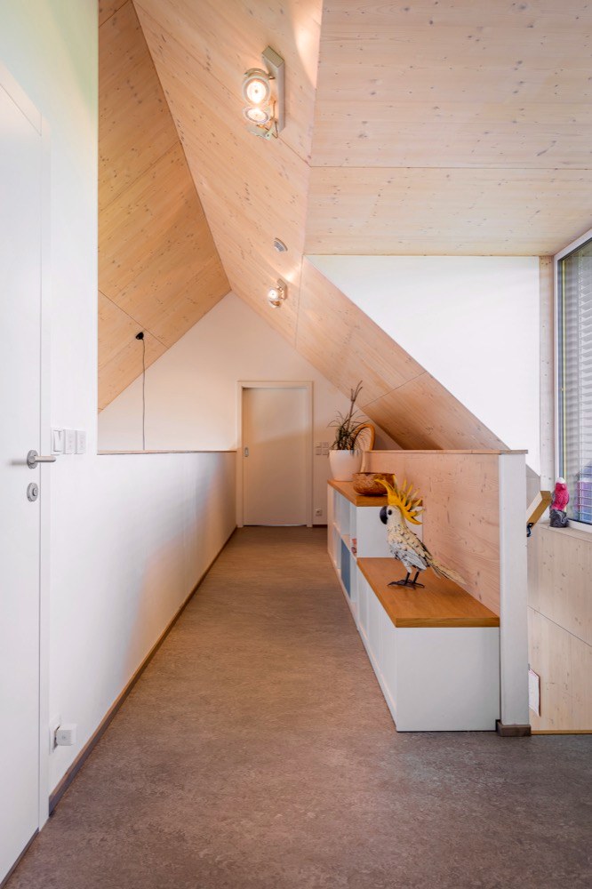 Majitelé domu oslovili architekty z Prodesi/Domesi ještě v době, kdy neměli děti a toužili především po vlastním prostorném domě se zahradou. Vyplatilo se jim ale při stavbě pomýšlet i na roky budoucí. Dnes dům obývají spolu se dvěma dětmi, psem a své místo tu mají i papoušci, které majitel chová a jimž na zahradě vybudoval prostornou voliéru.