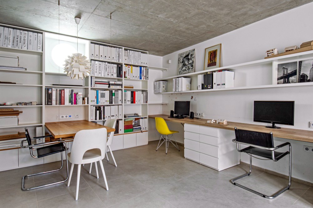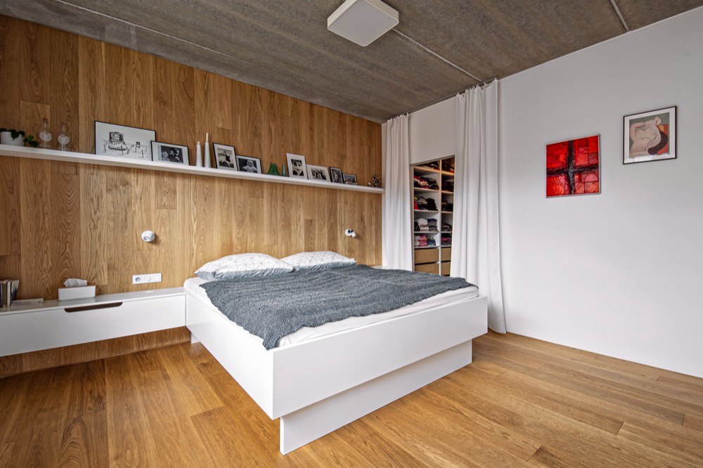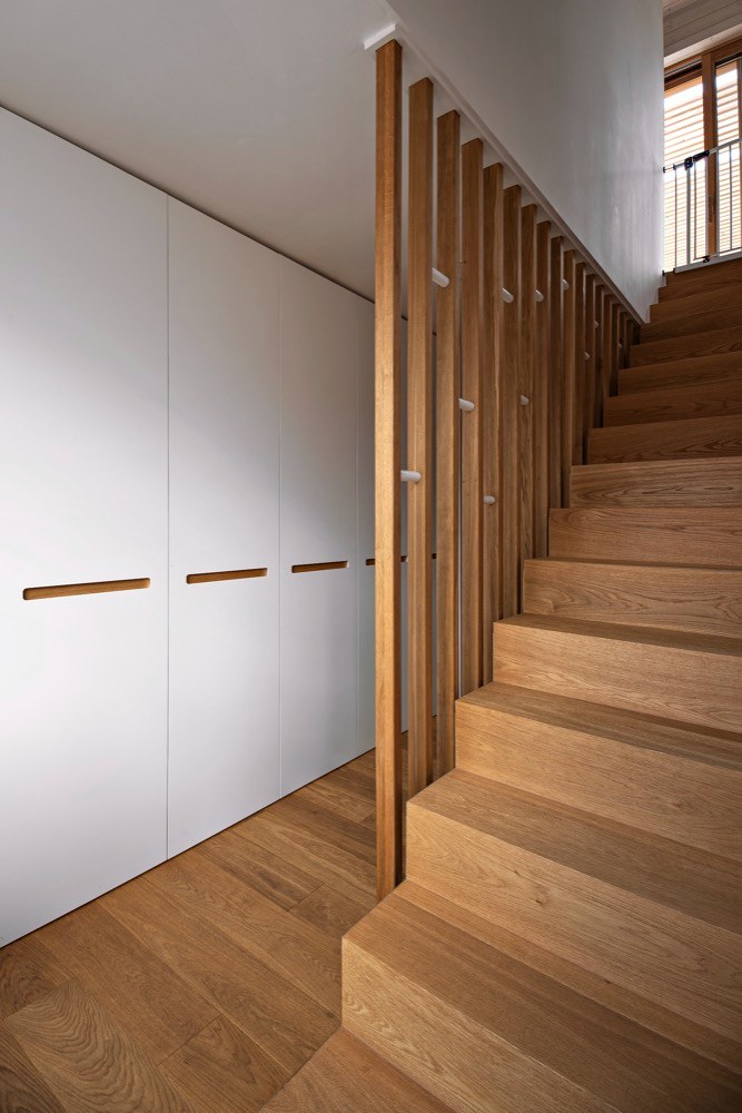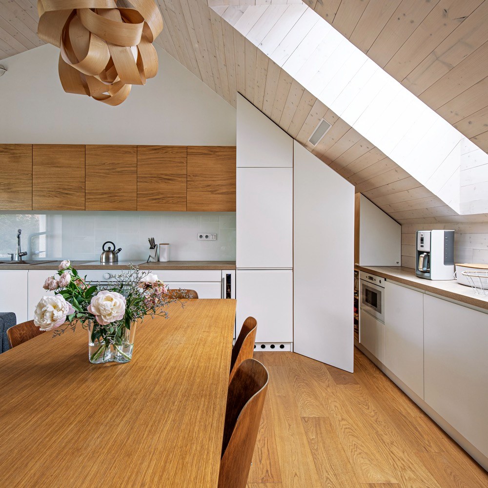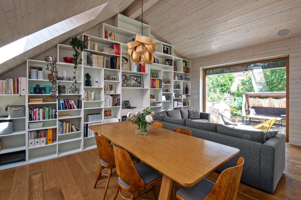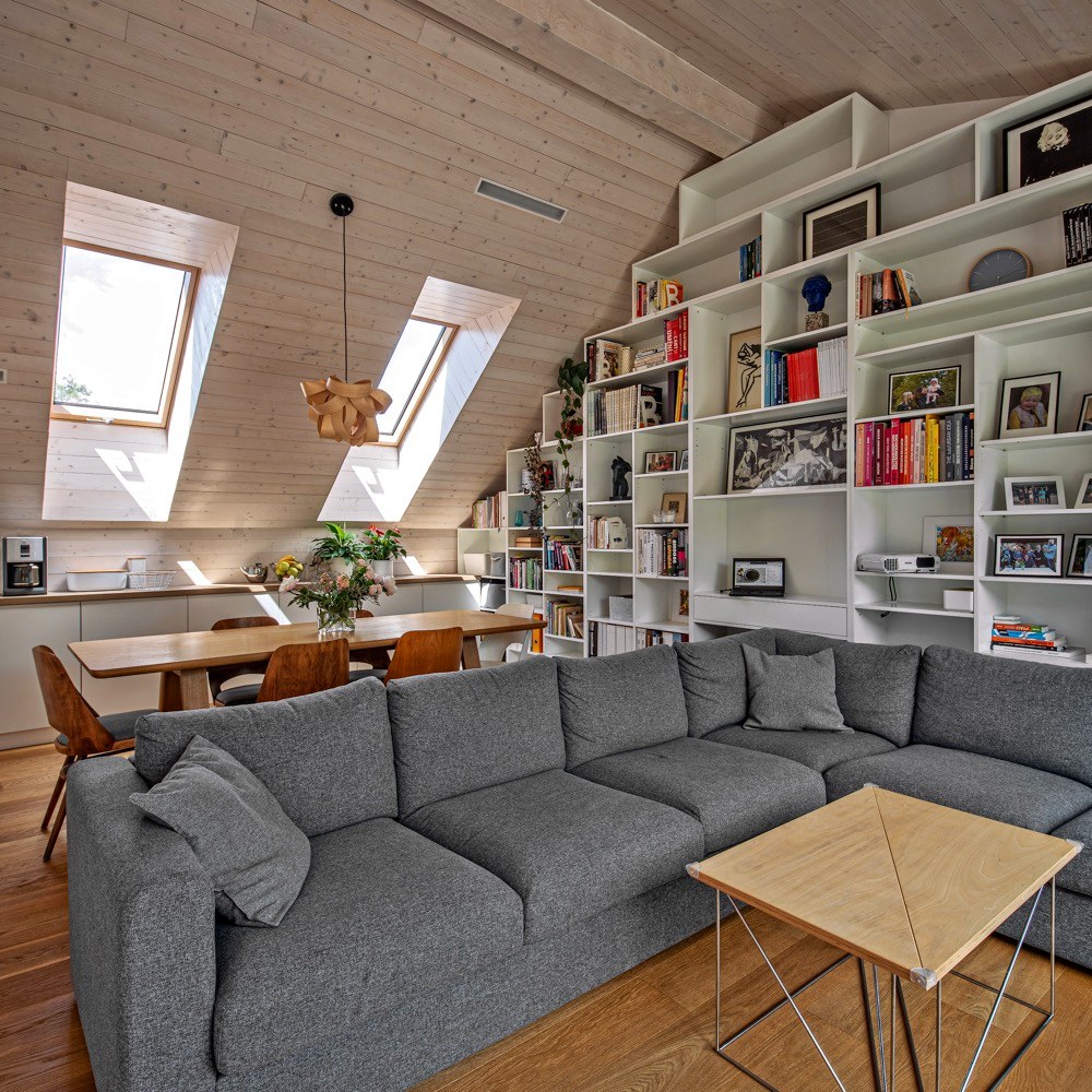 Interiér měl být jednoduchý a nadčasový, aby se brzy neokoukal. Je pojatý také velmi jednoduše, což dovoluje postupné doplňování či obměňování zařízení. Důležitým kritériem byla pro Veroniku i snadná údržba domu. Proto jsou veškeré prostory více méně minimalistické v materiálovém a barevném složení – bílá, dub, smrk, travertin a beton. Velký důraz kladla architektka i na úložné prostory. Vyřešila je vestavěnými skříněmi v chodbě, v dětském pokoji, šatnou v ložnici a také malým skladem v druhém podlaží. Veškerý nábytek je vyráběný na míru podle Veroničina návrhu. Dominantní je v podkrovním prostoru bílá knihovna, která vyplňuje celý štít. Na ni navazuje kuchyň v kombinaci bílé barvy a dubu. Teplo vnáší do velké otevřené podkrovní místnosti smrkové obložení. Nábytku zde najdete minimum. V jídelní části je dřevěný stůl značky TON, doplněný repasovanými retro židlemi. Obývací část vymezuje sedačka zakoupená v IKEA. Nehledejte televizi, tu zde nahrazuje stahovací promítací plátno a velké okno s výhledem na zabydlenou terasu. Celý interiér hezky propojuje dubová podlaha.
