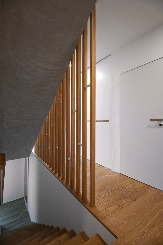 „S ohledem na svažitý terén jsem musela k projektu přistoupit opravdu netradičně. Z ulice stavba vypadá jako normální třípodlažní dům se sedlovou střechou. Z druhé strany se dům tváří jako jednopodlažní s velkou terasou, která přechází do zahrady. Zastavěná plocha tvoří polovinu parcely. Nezastavěná část parcely je překryta v úrovni třetího patra výše zmíněnou terasou, která rozšiřuje obytnou plochu domu. Pod terasou se nachází původní sklep a retenční nádrž na dešťovou vodu. Do přízemí jsem umístila samostatný ateliér a dále prostornou garáž. V druhém podlaží se nachází manželova pracovna, zázemí domu a ložnice s šatnou. V podkroví, které je velkoryse otevřené na terasu, je obývací pokoj s kuchyňským koutem, jídelnou a dětský pokoj. Na projektu je také atypické, že se dětský pokojík nenachází u ložnice rodičů v klidové části domu, ale je v podkroví u hlavního obytného prostoru. To vychází ze zvyklostí naší rodiny, protože v podstatě žijeme v obýváku a sedm měsíců v roce i na terase, která z něj ústí.“