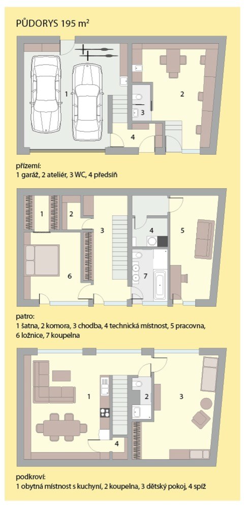 Užitná plocha: 195 m2 včetně garáže a ateliéru