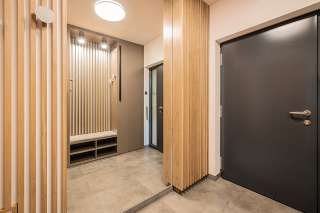 Vstup do domu nabízí příslib pohody a komfortu. Černě laděné vstupní dveře, situované poblíž garážových vrat, odhalují malou, avšak útulnou vstupní chodbu. Tento prostor zrcadlí přívětivou atmosféru, která je tak charakteristická pro celý dům. „Vizuální propojení exteriéru s interiérem bylo jedním z hlavních přání majitelů,“ upřesňuje designér Trakal, což prezentují dřevěné obklady stěn, které ladí s dveřmi, zárubněmi a jsou v souladu s celkovým obložením domu. Zbylé stěny vstupní chodby jsou bílé, vytvářející jasný a čistý prostor, který je opticky rozšířen a prosvětlen díky velkému obdélníkovému zrcadlu. Podlaha ze šedých dlaždic je pro chodbu praktická, lehce udržovatelná, nedávající na první pohled znát nečistoty. Na protější straně od zrcadla se nachází dvě obdélníkové skříně s černými úchyty, poskytující dostatek úložného prostoru například pro kabáty a boty. Zajímavým designovým prvkem jsou kulaté věšáky z dřevěných válečků s bílými kruhy jako úchyty, které se tvarově snoubí s kulatými světly nad lavicí a hlavním osvětlením místnosti. Tato světla nejen poskytují dostatečné osvětlení, ale také přispívají k celkovému estetickému dojmu prostoru.