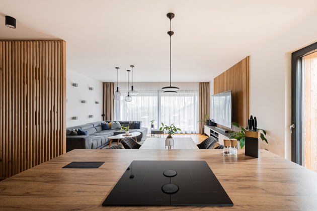 Vstup do obývacího pokoje s kuchyní ústí z chodby a je jediným otevřeným prostorem beze dveří. Tento vzdušný prostor je opět doplněn dřevěným obkladem pro zajištění kontinuity designu. Stěny zůstávají bílé a spolu s převahou dubového dřeva dodávají prostoru teplo a útulnost. „Podlahu v celém domě již měli klienti vybranou, a tak jsem částečně přizpůsoboval další návrhy této volbě,“ vysvětluje designér Trakal. Kuchyňskou linku vyráběla na míru truhlárna Ulrich. Její světlý dřevěný dekor na vrchních skříňkách, pracovní desce a ostrůvku kontrastuje se šedými skříňkami. Spotřebiče, včetně baterie, vestavěné mikrovlnné trouby a sklokeramické varné desky značky BOSH jsou černé a dodávají kuchyni sofistikovaný nádech. Kuchyňský ostrůvek navíc skrývá černou výsuvnou digestoř což je praktický, ale nenápadný detail v obsluze kuchyně. Podélné okno nad úrovní pracovní desky poskytuje nejen výhled do přírody, ale i přirozené světlo.