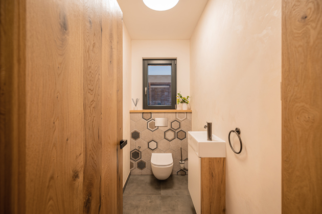 Zdánlivě skromná stavba je příkladem dokonalého sjednocení venkovního obkladu s interiérem, doslova s každou místností domu. Jeho skutečné poklady rozhodně nejsou ukryty v trezoru, ale viditelně rozptýlené. Pečlivý výběr nábytku, barev či použitých materiálů je znát v každém koutě až po nejmenší detaily, jakými jsou solnička s pepřenkou.
