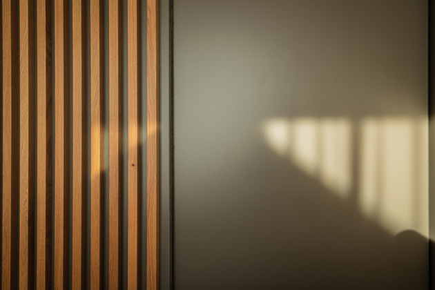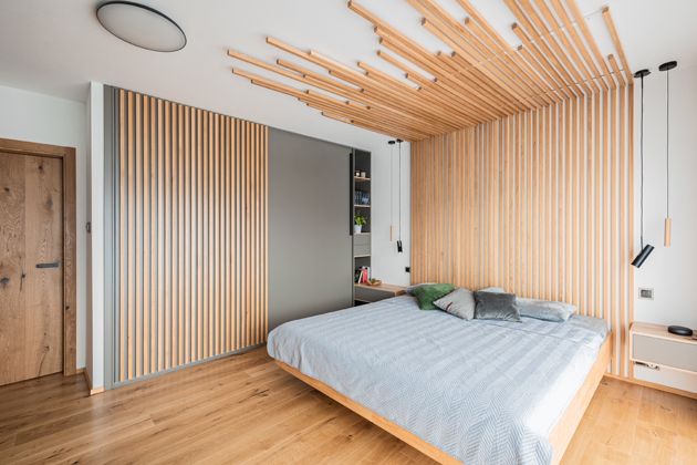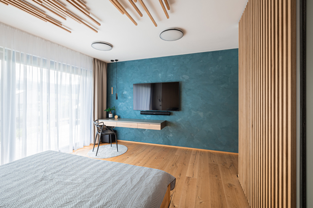 V ložnici však nejvíc upoutá pozornost levitující postel, což prostoru dodává pocit lehkosti. Tento efekt je umocněn dřevěnou konstrukcí, která se rozprostírá od podlahy, přes stěnu až na strop, připomínající zakořenění stromu s laťkami různých délek, vytvářejícími efekt zvukového vlnění. „Tato unikátní instalace byla technicky náročná. Zpočátku byl jen nápad a návrh, pak bylo potřeba přesvědčit klienty, a nakonec jsme museli vymyslet technické řešení,“ vysvětluje designér a pokračuje: „Narazili jsme na problém s konstrukcí stropu, který nebyl připravený na takové zavěšení. Po konzultaci s odborníky jsme ale našli řešení: laťový strop je prokotven skrz strop do střešní trámové konstrukce, která celý panel nese.“ Nad postelí jsou na každé straně dvě závěsné lampy s válcovitými svítidly, jedna v černé barvě a druhá v dekoru dřeva. Stejná jsou i nad psacím stolem, který je umístěn, stejně jako televize na protější stěně, která je zvýrazněna sytou modrou stěrkou. „Původně jsem zvažoval šedý odstín pro koncepční propojení, ale nakonec jsme se s majiteli shodli, že se odvážíme vytvořit něco výjimečného. A vyplatilo se! Odvážný odstín modré povýšil ložnici na zcela novou úroveň.“ Ložnice má také vlastní výstup ven, což poskytuje příjemnou možnost přímého přístupu na terasu nebo do zahrady. Detaily jako barevné akcenty, jedinečné osvětlení, nápadité řešení nábytku vytvářejí v ložnici atmosféru pohodlí a luxusu, čímž se stává opravdovým srdcem domova.