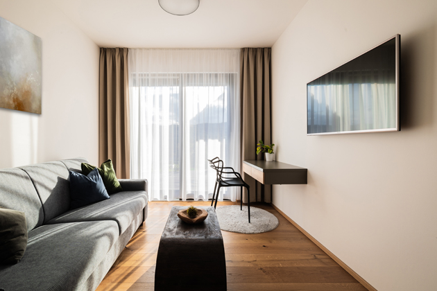 Ihned první místností vedle obývacího pokoje je multifunkční místnost, která může fungovat jako menší obývací pokoj, pracovna nebo pokoj pro hosty. Podlaha je opět z přírodního dřeva a stěny bílé, zůstávají tak v souladu s celkovým designem domu. V místnosti dominuje na šířku umístěný obraz opět od Terezadesign. „Paní Tereza tvoří kouzelné kombinace jednoduchých barevných kombinací, a proto byly její obrazy jasnou volbou,“ říká designér Trakal. Hned vedle dveří se nachází vestavěná dřevěná skříň, která je zbarvena do šeda. Dřevěný obklad, provázející celý dům se zde objevuje na druhém křídle šatní skříně. Pohovka je opět v tónech šedi a před ní stojí masivní rustikální oválný konferenční stolek, který vypadá, jako by byl vyřezaný z celého kmene. Svým provedením přitahuje pozornost. Naproti pohovce ihned vedle televize umístěné na zdi je pracovní koutek vybavený zavěšeným stolem na zeď a atypickou židlí. Pokoj disponuje velkým oknem s možností východu přímo na terasu. Soukromí a také útulnost pokoje poskytují záclona a závěs, které rámují okno, barevné polštářky na pohovce a šedý chlupatý koberec ve tvaru kruhu.