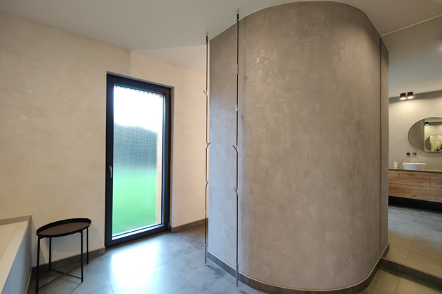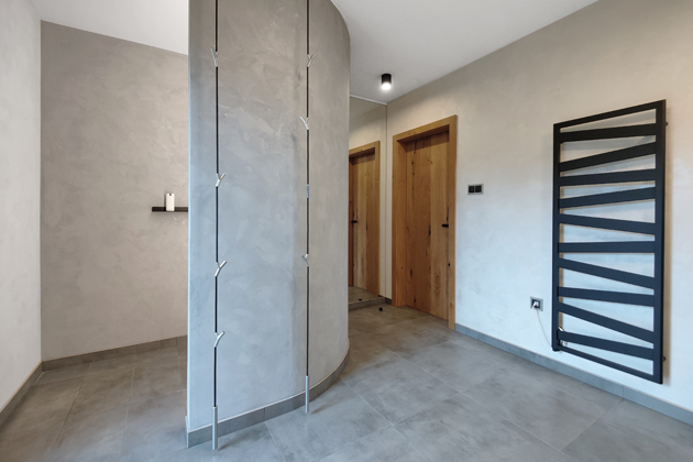 Na konci chodby se nachází koupelna, která překvapuje svou neobvyklou prostorností. Po vstupu do ní překvapí oblouková šedá stěna, zabírající téměř celou její polovinu, za kterou se skrývá prostorný sprchový kout. „Stěna je vystavena v kombinaci Ytongu a voděodolného sádrokartonu, který je opatřen hydroizolační vrstvou vytvořenou specialistou,“ vysvětluje Josef Trakal a dodává: „Nátěr je betonová stěrka, báze Magic touch od firmy Zero barvy, která se používá právě do vlhkých prostor a má vrstvu odpuzující vodu.“ Kout je vybaven stropní sprchou a nástěnnou baterií s minimalistickou sprchovou hadicí. Vedle oblouku je umístěno velké zrcadlo, které nejen že je praktickou nutností, ale zároveň působí jako elegantní dekorace a opticky prodlužuje prostor.