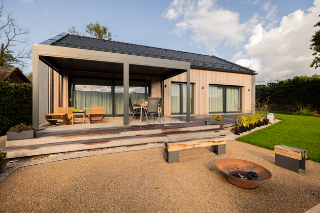 Dům zvenčí působí minimalisticky a jeho dřevěné obložení mu dodává teplý a přívětivý charakter. Boční stěna je otevřená až do střešní špice. Jednoduchý obdélníkový půdorys stavby je z jedné strany doplněn garáží a z druhé prostornou terasou. Garáž domu je obložená tmavě šedým cihlovým obkladem, který vhodným kontrastem doplňuje celkový vzhled stavby. Terasa, umístěná na opačné straně domu je zastřešena kovovou konstrukcí a vybavena venkovním jídelním stolem, židlemi a dvěma dřevěnými lehátky. Dva schody vedoucí z terasy do zahrady zvou nejen k pečlivě upravenému trávníku ale i na písčitou plochou, která slouží jako útulné místo pro posezení či opečení špekáčků. Ohniště je vytvořené z kovové konstrukce a obklopené lavičkami ladícími s dřevěným fasádním obkladem.