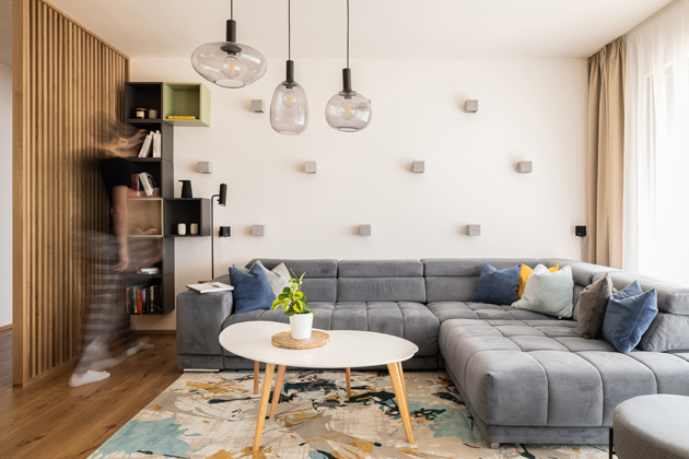 Osvěžení místnosti přináší barvy jako žlutá a modrá, které jsou prezentovány v malých detailech. Velké žluté hodiny na stěně se skvěle doplňují se žlutými a modrými polštářky na pohovce. Všechny tyto barvy se na konec spojují na koberečku v podobě béžového podkladu s barevnými – modrými a žlutými detaily, což společně dodává místnosti hravost a živost, ale navíc navozuje atmosféru uměleckého díla na podlaze. Na koberečku stojí jednoduchý konferenční stolek, který je neutrálně bílý ve tvaru obláčku s dřevěnými nožkami.