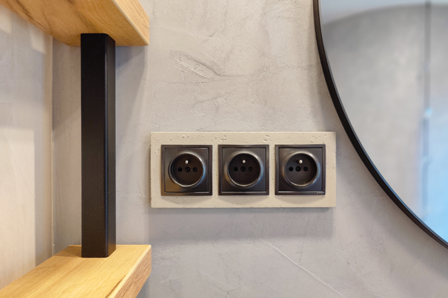 Osvětlení v celé místnosti už jen umocňuje dojem perfekcionismu. V kuchyni jsou použitá jednoduchá černá válečková svítidla u stropu, která se směrem k obývacímu pokoji mění a stávají se více výraznými. Nad jídelním prostorem visí světla opět inspirovaná válečky, avšak protáhlá a na konci tvarující se do úzkých kruhů, zatímco v obývací části již přechází ve skleněné bubliny. Završením této světelné symfonie je stěna s nenápadnými betonovými kostkami, které se naplno ukážou až po rozsvícení, kdy vytvářejí na stěně fascinující obrazce zářivých a stínových efektů. Každý prvek v této místnosti byl pečlivě promyšlen a zařazen tak, aby společně vytvářely koherentní a přívětivý prostor, který je příkladem toho, že může být hravý a zároveň si stále zanechat elegantní vzhled.