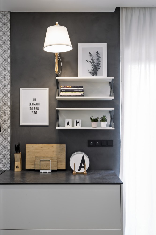 Zdobí ji stěrka a police s kříži vyráběnými u zámečníka. Kuchyň oživuje obklad opět s dekorem křížků. Jídelní stůl je z masivu, černé a bílé židle značky TON. Obývací pokoj je nezatížený nábytkem a hezky je tu propojená část kuchyně a společenského posezení před televizí. Funkčním i estetickým doplňkem jsou nástěnné lampy s výsuvným ramenem od firmy Claro.