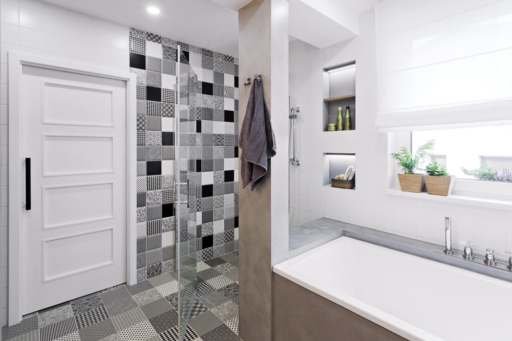 Celkový dojem z interiéru pozvedá tmavě šedá dekorační stěrka na zdi v kuchyni, v pokoji a v koupelně. Prvkem, který se prolíná celým interiérem, je tvar křížku. Dává mu tak hravost a osobitost, kterou jsem tam chtěla vnést.