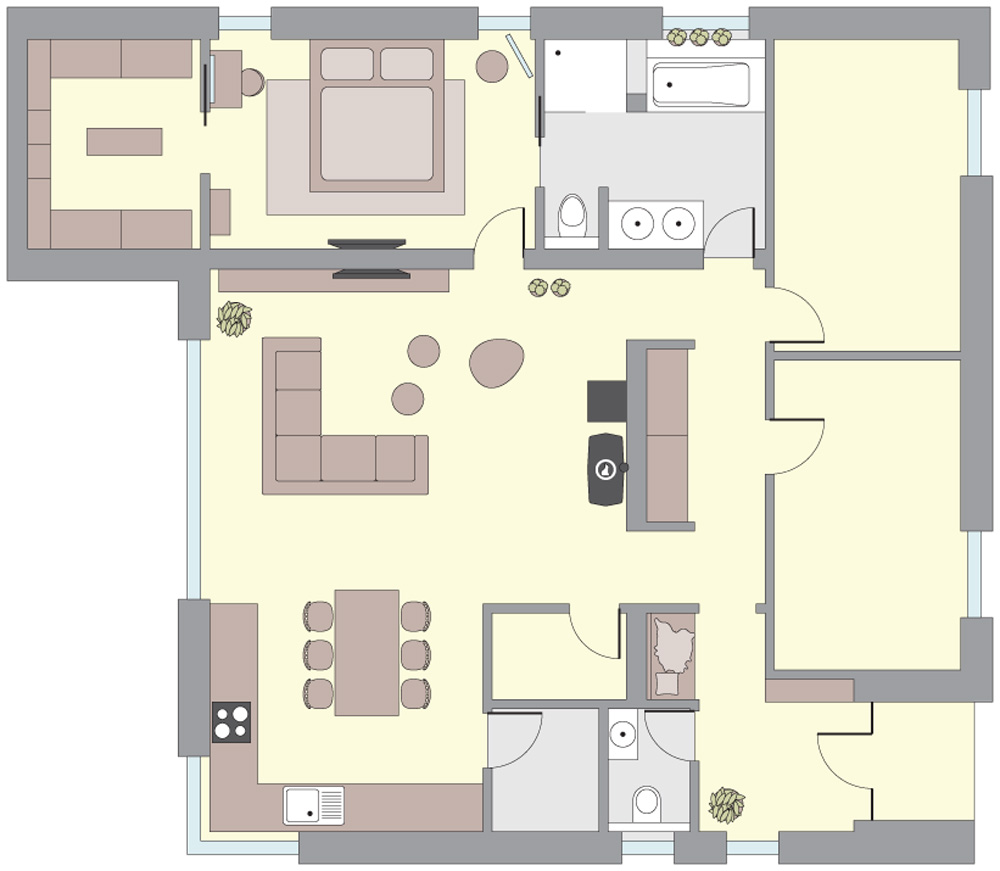 Protože stěny nebylo nutné zahltit skříněmi, šlo si tady hezky pohrát i s dekoracemi. Vzala jsem tedy stávající dispozici a navrhla zařízení do jednotlivých místností. Jediné, co mi přišlo dobré změnit, bylo prodloužit krbovou stěnu z jedné strany až ke zdi, takže by byl vstup do obýváku jenom jeden. Říkala jsem si, že v budoucnu by se klientce možná hodila ještě jedna skříň, ale ona si vyloženě přála mít takový krbový ostrůvek. Nakonec to vypadá dobře a mně to připadá, jako by ji ten domeček objímal.