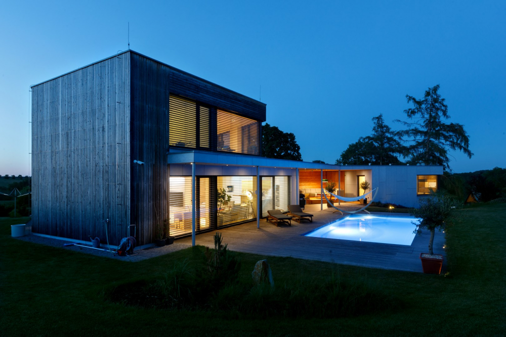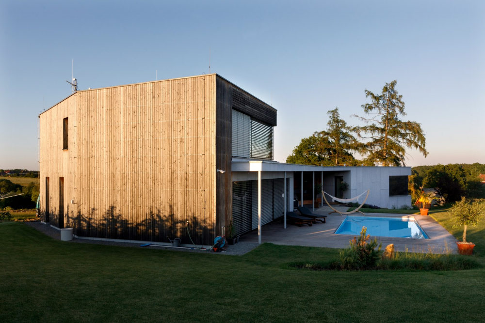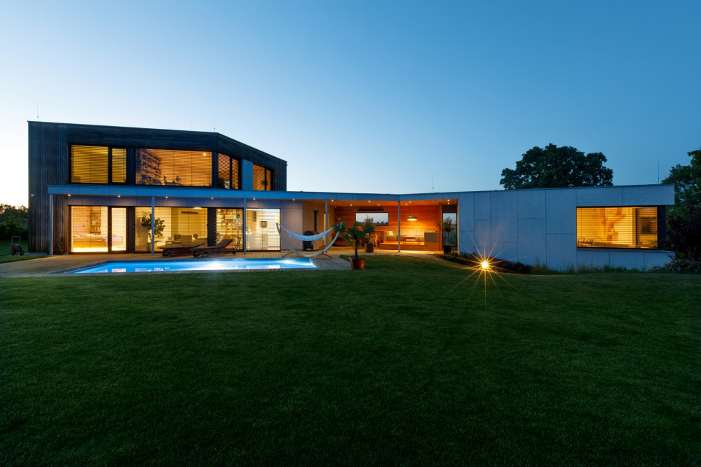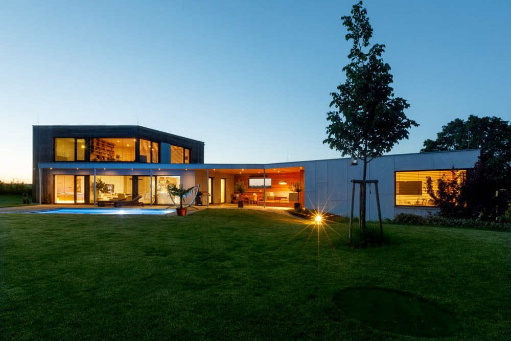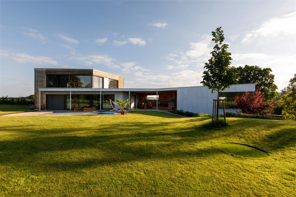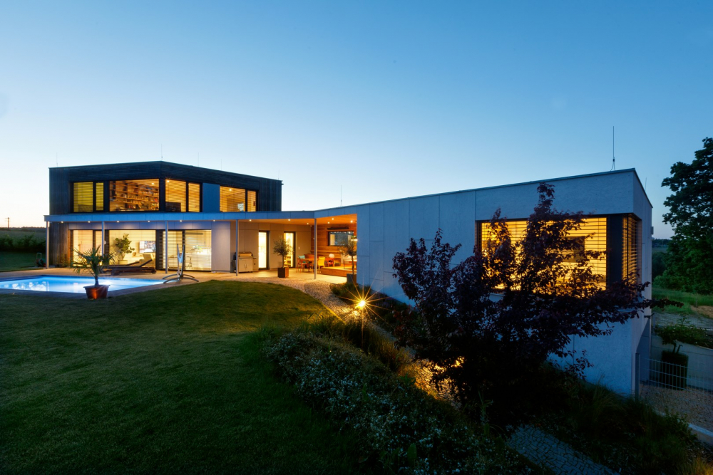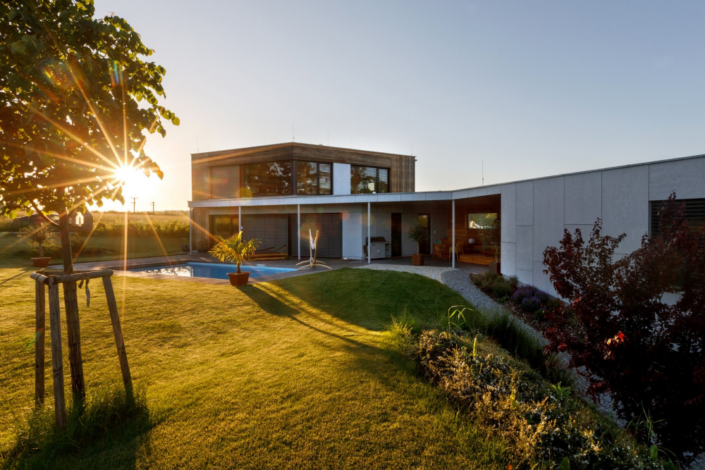 Dům je průnikem všech požadavků investora – je nízkoenergetický (prošel Blower door testem a získal dotaci Zelená úsporám), s dokonalou dispozicí a návazností na zahradu, poskytuje krásné výhledy a svým originálním tvarem zkráceného jehlanu harmonizuje s atypickým pozemkem.
