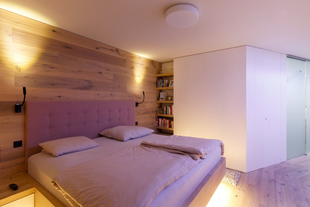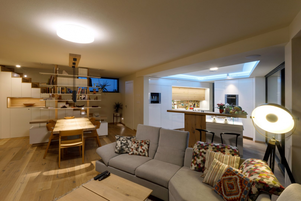 Nainstalovaná byla inteligentní elektroinstalace, díky níž jsou ovládány žaluzie, osvětlení, topení i zabezpečení domu a třeba i hudba jen rozvedena tak, aby vytvářela různou atmosféru. Obrovskou výhodou je zastřešená terasa chráněná před sluncem, kterou majitel využívá v letních měsících i k práci. Prostě „user friendly“ dům.