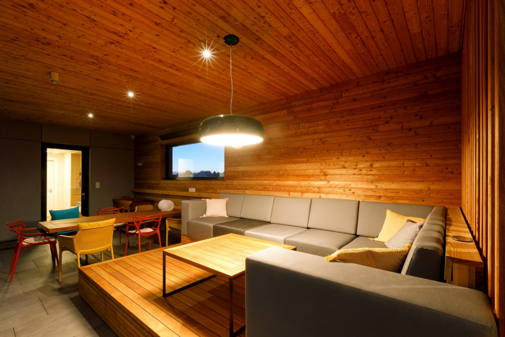 Dům je rozdělený na dvě části propojené terasou. Jednu část objektu tvoří zmiňované podzemní podlaží s garáží, nad ním je prostor využívaný k pracovním schůzkám nebo setkáním s přáteli, nachází se tu i malá koupelna a sauna. Majitel oceňuje, že zejména pracovní návštěvy tak nezasahují do soukromého obytného prostoru. Z garáže se po schodišti vystoupá na krytou terasu, která je na úrovni přízemí. Terasa propojuje první část domu s tou druhou, kde se nachází rodinné zázemí. Na severní straně je terasa obezděná, čímž se zde podařilo vytvořit úžasné mikroklima – zastřešený prostor je dobře ukryt před pohledy zvenčí a majitelé si mohou nerušeně užívat nejen terasu, ale i navazující bazén.