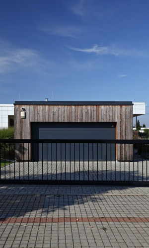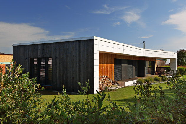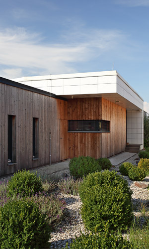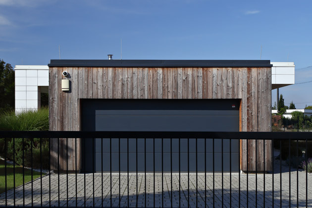 Rodinný dům architekti citlivě usadili na rovinatý pozemek do nově vznikající části obce. Podlouhlá stavba je přízemní s plochou střechou. Dominantním prvkem domu je bíle obložený prstenec, který stavbu jakoby obepíná. V jižní části tvoří tento prstenec terasu a její zastřešení a přechází na sever ve střechu nad vstup. Bíle obložená hmota domu má zajímavou estetickou funkci – obdélník, který tvoří základní půdorys budovy, je dynamickou křivkou přesahu střechy příjemně narušen, což vytváří dojem nepravidelného zalomeného tvaru. Z hmoty domu vybíhá dvojgaráž, která není s domem přímo spojená. Díky přesahu rovné střechy se ale dá z garáže přejít do domu „suchou nohou“. Fasádu částečně tvoří svislé modřínové palubky bez povrchové úpravy, které tak časem přirozeně stárnou a mění barvu dle povětrnostních vlivů. Již zmíněný bílý prstenec je obložený fasádními deskami (CEMBRIT). Konstrukčně je dům dřevostavbou z masivních dřevěných panelů křížem lepeného dřeva – CLT (Novatop), které jsou z velké části uplatněny také pohledově v interiéru.