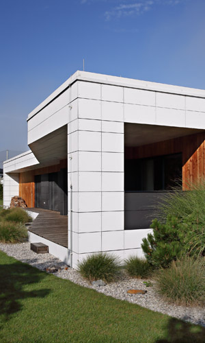 Svislá nosná konstrukce dřevostavby je z velkoformátových komponentů lepených z masivního smrkového dřeva (systém NOVATOP). Garáž má sloupkovou konstrukci TBF. Pro obvodové a vnitřní nosné stěny jsou použity panely NOVATOP SOLID – tl. 84 mm. Stropní trámy tvoří hranoly z KVH. Skladba obvodového pláště se liší v závislosti na povrchové úpravě fasády – někde je použit dřevěný svislý modřínový obklad a dále obklad CEMBRIT EXPRESS Bílá a CEMBRIT EXPRESS Grafitová, sokl má povrchovou úpravu Marmolit v odstínu antracit.