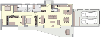 Dispozičně je dům řešený jako jednopodlažní 4+kk. Na jih jsou orientované dva pokoje a obytný prostor s terasou, jenž je umístěn v přímé návaznosti na vstup a nechybí v něm kuchyňský a pracovní kout. Odtud se přes chodbu dostanete do dvou dětských pokojů, dvou koupelen s toaletou a do hlavní ložnice, která má svůj soukromý pohled do západní části zahrady. V dispozici je také praktické zázemí, jako je spíž umístěná u kuchyňského koutu a technická místnost, která navazuje na prostornou předsíň.