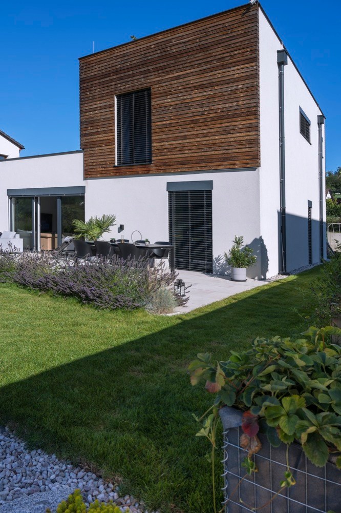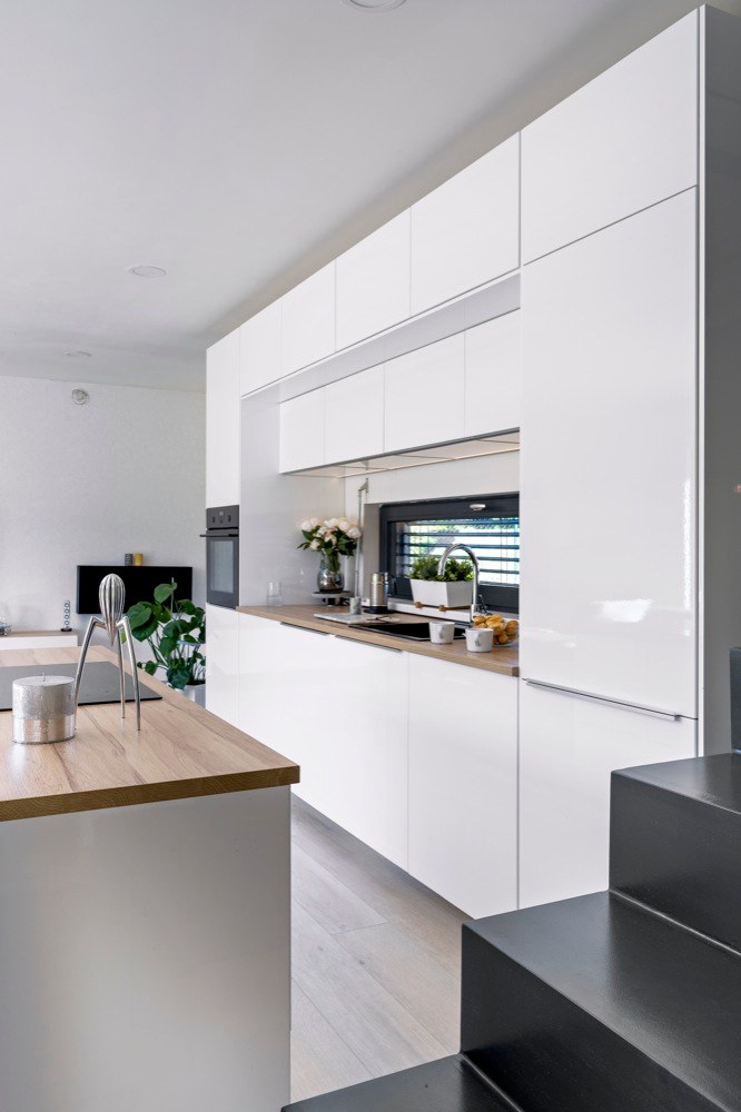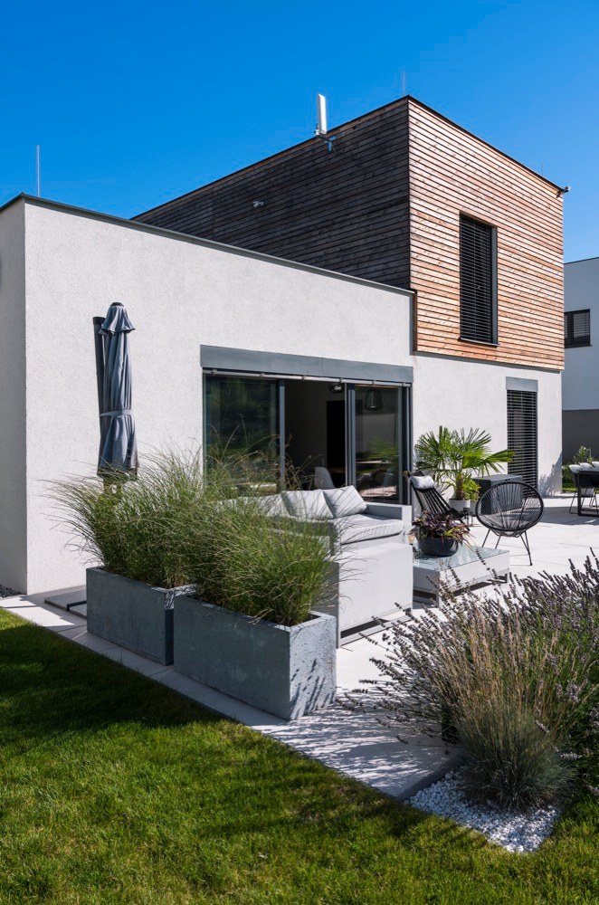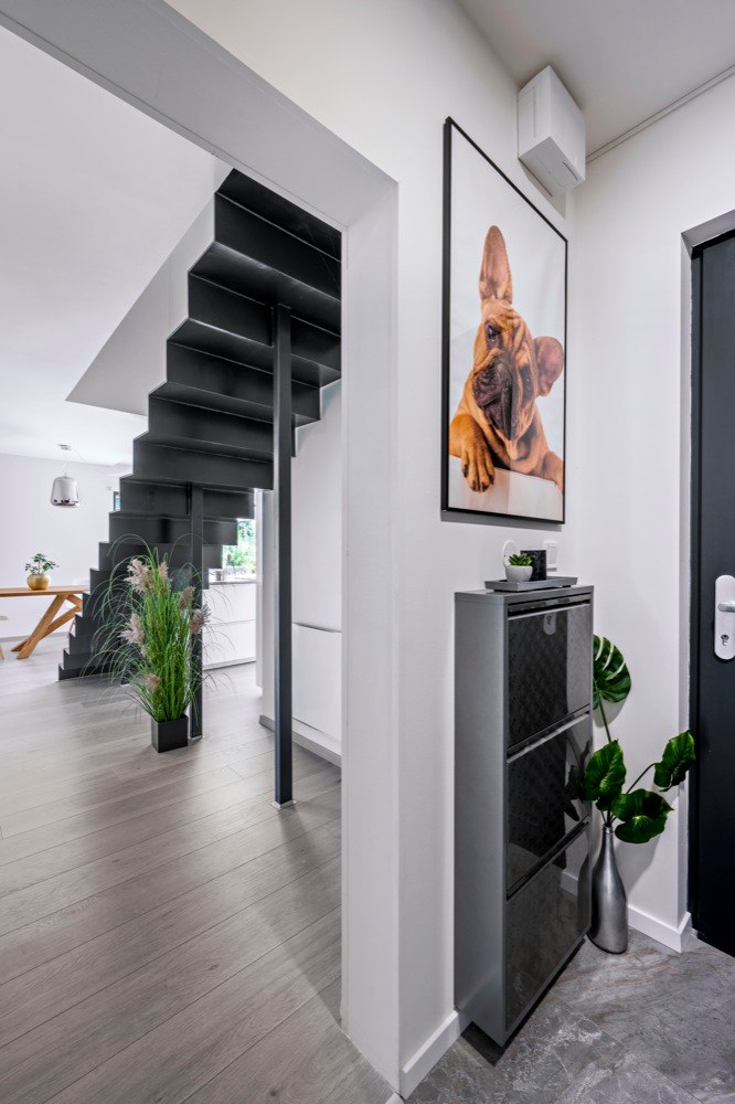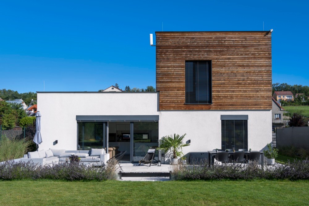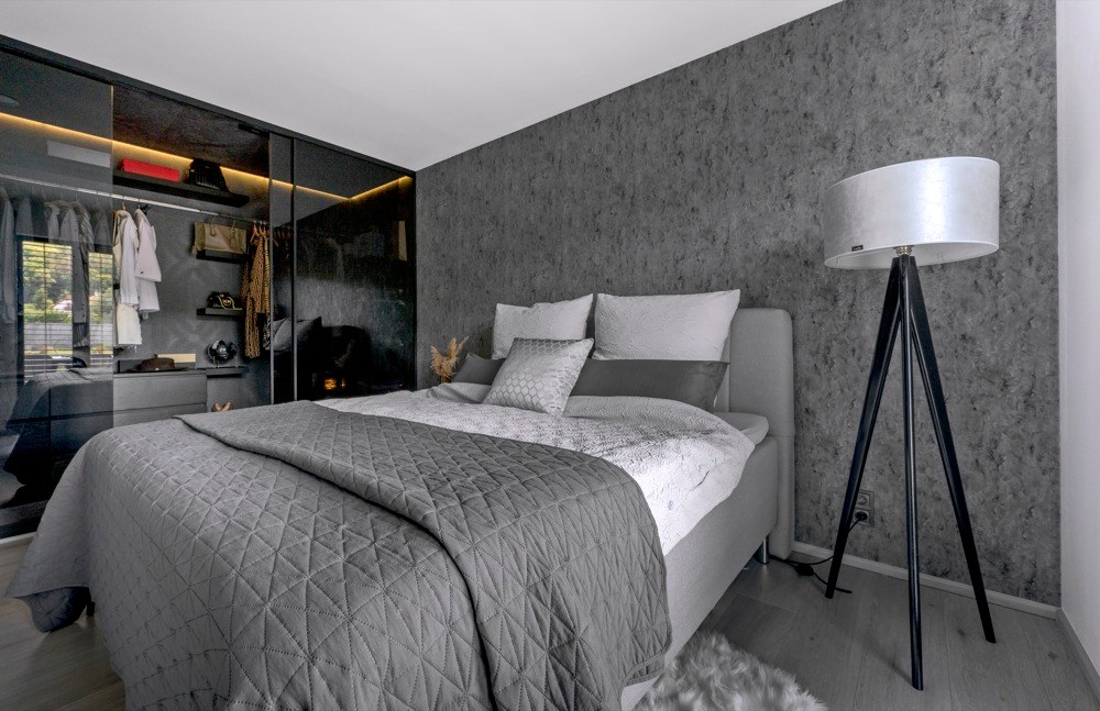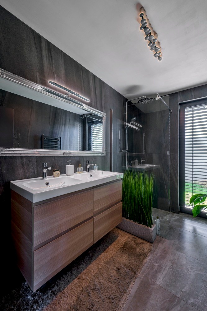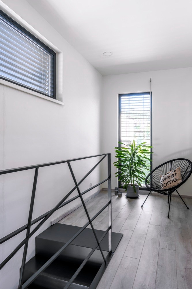Původní projekt na přízemní dřevostavbu ve tvaru písmene L úřady vzhledem k nedaleko tekoucímu potoku zamítly. Zuzka a její partner František nechali vypracovat nový projekt na dům, který se musel vejít do jedné třetiny tisícimetrového pozemku co nejdále od potoka. Dřevostavbu navrhnul Zuzky bratr architekt. Žije ovšem na Slovensku, a tak mu sestra každý den posílala fotky probíhající stavby a se smíchem říká, že bratr jim dům postavil on-line. Dokonce jim ze Slovenska pozval své šikovné dělníky, kteří celý dům postavili za tři měsíce. Patrový dům si logicky žádal schody. Zuzka našla na Pinterestu minimalistické kovové schody, které vypadaly, jako by levitovaly v prostoru. Částka za ně byla závratná, proto majitelé oslovili kováře, což byla velká výzva pro obě strany. Se zřetelem na dřevostavbu nebylo možné šest set kilogramů vážící schody ukotvit do stěn, a tudíž bylo nutné je podepřít. Vzhledem k jejich váze je dělníci přivezli ve čtyřech kusech a každý kus zvedalo pět silných chlapů. Co se týká ostatního zařízení domu, Zuzka s Františkem razí heslo, že než mít všechno hned, raději si počkají. „Nehledáme věci nejlevnější, ale nemáme ani na ty drahé, které se nám líbí, proto se inspirujeme na internetu, sledujeme zahraniční vlogy týkající se bydlení a následně hledáme někoho, kdo nám danou věc vyrobí za přijatelnou cenu a zároveň rád přijme výzvu, i když to pro něj bude znamenat vyjít ze své komfortní zóny,“ říká Zuzka. Jedné takové výzvy se s nadšením ujal kovář z Bongi Design, který na míru vyrobil dva metry dlouhý bio krb na terasu. I samotní majitelé mají rádi výzvy, a proto si sami navrhli walk-in šatnu v ložnici včetně jejího zařízení v podobě úžasné vliesové tapety koženého vzhledu od firmy Vavex a polic a komod z IKEA. Při zařizování svého domova Zuzka využívá i sílu barev, což je patrné v koupelně nebo v ložnici, které jsou tmavší než ostatní části domu, a navozují tak příjemnou wellness náladu. Ráda se odlišuje, hledá jedinečné věci a ráda podpoří lokální designéry.