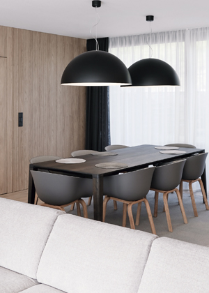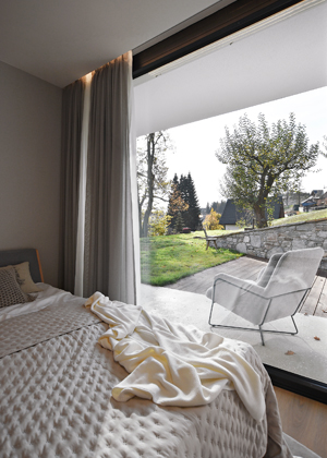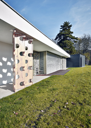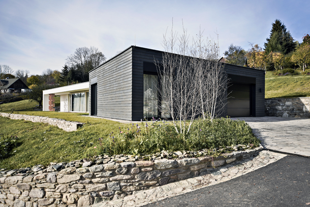 Aby dům respektoval přirozený terén louky, která tam byla, usadili a natočili jsme ho trošku jinak, než byl původní dům. Terénních úprav tedy nebylo mnoho, akorát se zpevňovala a lehce zvedala zídka, aby mohla vzniknout severní terasa. Co se týká barevného pojetí domu, chtěli jsme mu dát nějaký tradiční prvek. Vyšlo nám z toho dřevěné peření, což je obkládání tradičním způsobem používané v horských oblastech. Zároveň měla být stavba ekonomická, takže jsme věděli, že nebudeme dům obkládat celý, ale jen část s garáží a zázemím pro hosty. Černé obložení dělá protiváhu té jednoduché bílošedé hmotě domu. Šperkem, který zdobí dům, je dřevěný vyřezávaný paraván, který funguje jako natáčecí slunolam.