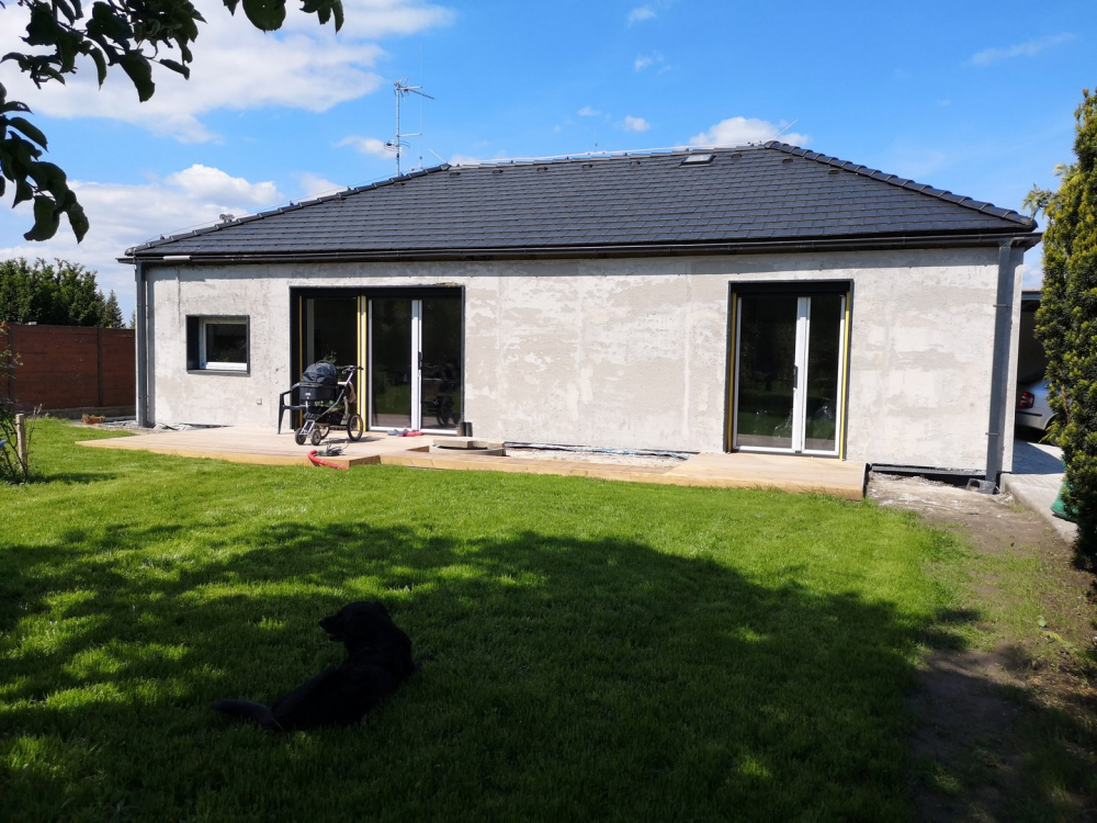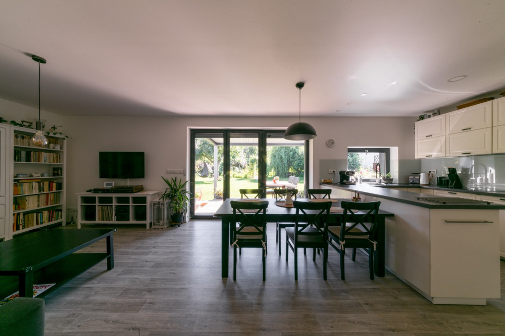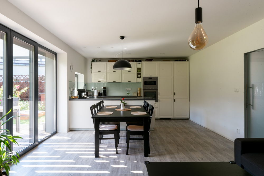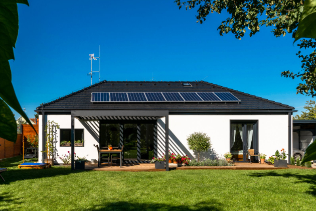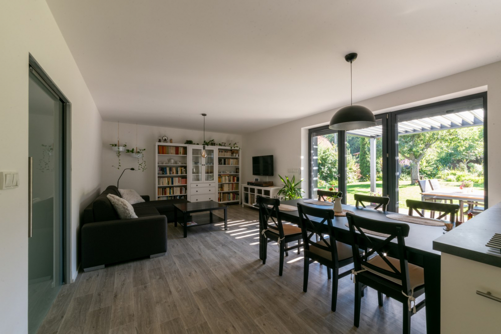 A jaké požadavky investorů byly pro projekt důležité? „Jelikož majitelům už všechny tři děti vylétly z hnízda, záměrem bylo vytvořit na stávajících základech pouze jednopodlažní dům s dispozicí 4+kk, který by splňoval požadavky manželů na velký obytný prostor, aby se celá rodina mohla scházet u stolu a zároveň každý pár měl vlastní místnost pro své soukromí. Dům je koncipován tak, aby splňoval parametry nízkoenergetického standardu. Byl volen kompaktní a jednoduchý tvar s kvalitní dispozicí a účelovou kompozicí okenních otvorů,“ popisuje základní charakteristiku David Musil.