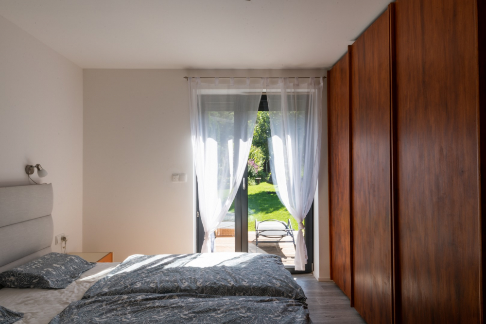 Po pravé straně se nachází samostatná toaleta, koupelna a šatna, která ale může sloužit i jako pokoj pro hosty. Po levé straně je pak ložnice manželů a vstup do obytného prostoru s kuchyňským koutem. Na konci chodby je situován poslední pokoj. „Kompozice oken vychází z dispozičního řešení objektu a umístění domu na nároží. Vzhledem k tomu, že severní fasáda kopíruje uliční čáru, jsou okna umístěna pouze na fasádách orientovaných do zahrady. Z obytného prostoru a ložnice vedou velká francouzská okna na jižní terasu,“ dodává David Musil. Právě úzký kontakt interiéru se zahradou si manželé velmi pochvalují.