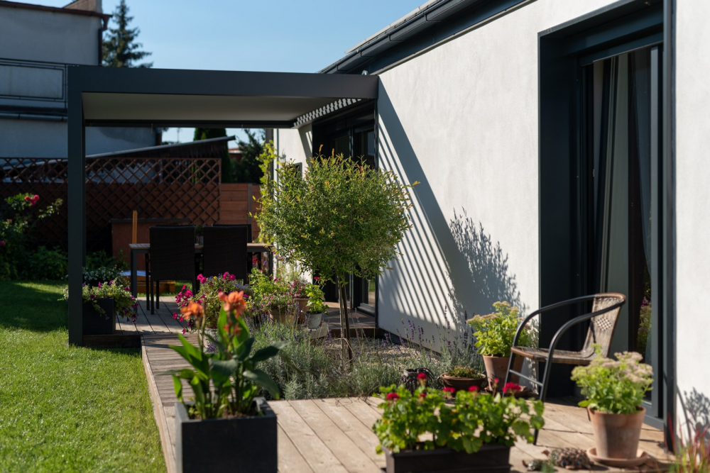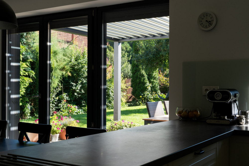 „David věděl, jak ráda pobývám na zahradě. V předchozím domě jsme měli výhled na zahradu omezený, okna z kuchyně v patře vedla do ulice, směrem, odkud přišel výbuch. V novém domě je tato strana téměř celá uzavřená a v podstatě ze všech oken hledíme do zahrady. Vidím na ni i z kuchyňského okénka u dřezu a také z pokoje orientovaného západním směrem je vidět kus zahrady. Pořád jsme vlastně v kontaktu s přírodou,“ chválí si investorka a dodává, že další výhodou, kterou s manželem oceňují, je bezbariérovost jejich nového domova: „Žádné schody, které je třeba zdolávat, bezbariérový přístup je i na zahradu, prostě nádhera!“