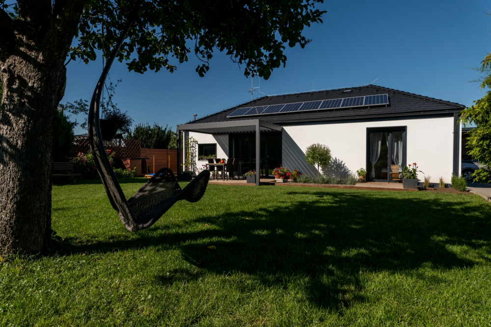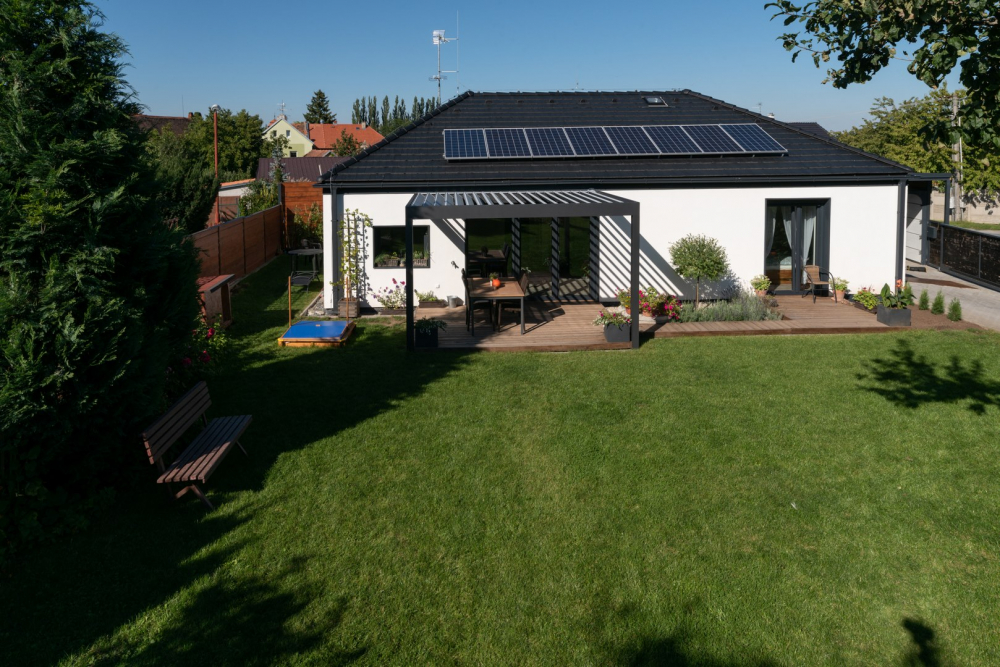 Objekt je omítnutý bílou omítkou. Pro podpoření architektonického výrazu jsou použity okenní rámy v barvě antracit, jak v exteriéru, tak i v interiéru, a betonové střešní tašky Tegalit v černé barvě. Venkovní garáž a oplocení je provedeno z opalovaného dřeva, které je rovněž nezanedbatelným prvkem dotvářejícím architekturu domu. „Pořád zbývá dokončit určité detaily, zejména v zahradě, kde nicméně máme to nejhorší za sebou – byla hodně poškozená jak výbuchem, tak demolicí starého domu i stavbou nového. Už loni jsme založili nový trávník, obnovili záhony, hotová je i nová pergola, takže zbývají opravdu jen drobnosti,“ líčí paní Skřivánková. Komfortní bydlení v novém domě si s manželem pochvalují. „Máme moderní dům, energeticky nenáročný, bez větších nároků na údržbu, bezbariérový. Nejvíc si užíváme pohodlí, vstup na zahradu a výhled. Jsme za to strašně šťastní,“ říká paní Skřivánková a dodává, že je nejvyšší čas hodit všechno špatné za hlavu a s novým domem začít i novou etapu života. Nezbývá než popřát do této další kapitoly jen to dobré.