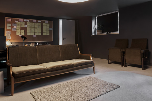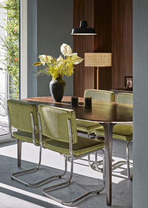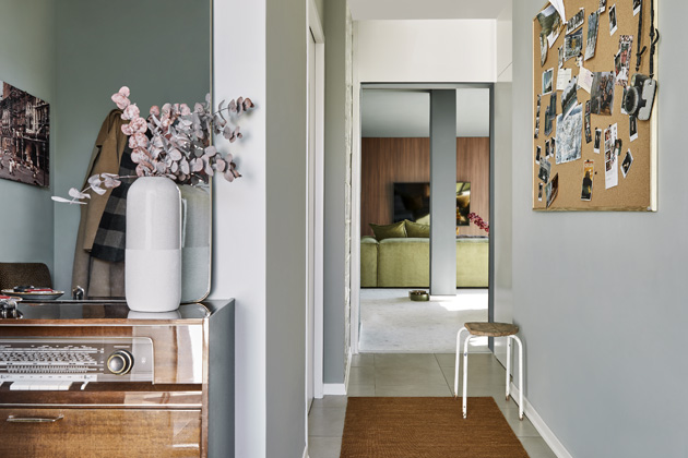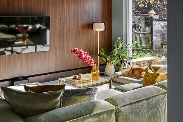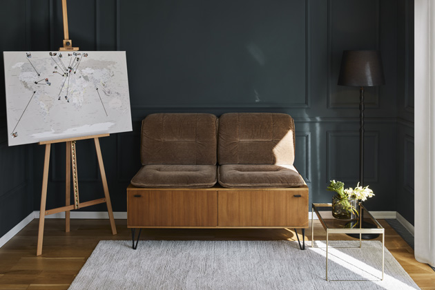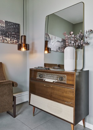 Středobodem místnosti je prostorná modulární pohovka s rovněž zeleným manšestrovým potahem. Důležitou součástí je zde i konferenční stolek s ratanovými detaily, který Lena s Davidem často a rádi používají jako příležitostný jídelní stůl. Místnost zútulňuje dřevěný obklad stěn. Dokonalý retro nádech ještě dokresluje nábytek z poloviny minulého století. O přísun denního světla se starají okna od podlahy až ke stropu, jimiž se vchází na terasu, a stropní světlovody v prostoru nad kuchyňskou linkou.