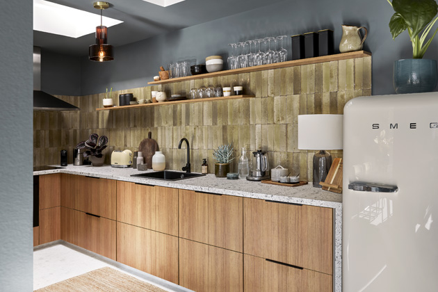 Z chodby se vchází přímo do hlavního obytného prostoru s kuchyní, jídelnou a obývákem. Dekorativně je ale tato velká světlá místnost členěná tak, že je každá její funkční část jiná. Kuchyňský kout vymezuje podlaha z teraca a obklad za pracovní deskou z lesklých obdélníkových obkládaček v barvě khaki.