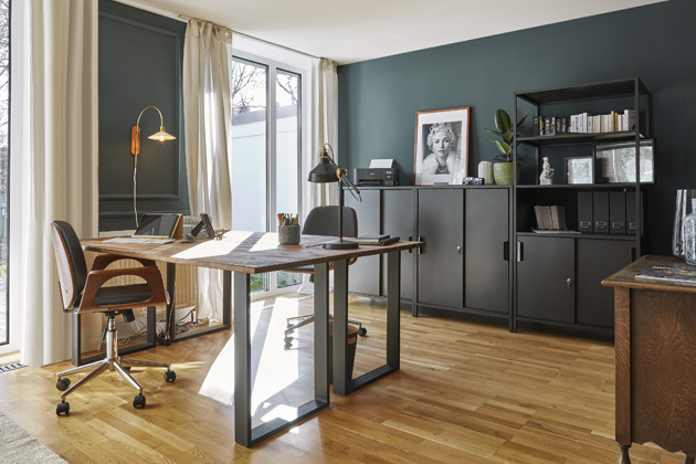 Lena si pro sebe zařídila pracovnu v britském stylu. Eleganci jí dodává kombinace dřeva a tmavého kovu. Tmavě modré stěny zdobí již zmiňované štukové lišty. Tady prý herečka ráda sedí, cítí se důležitá a někdy toho ani moc neudělá. David si zařídil svou pracovnu v suterénu. Využívá ji jako střižnu a podcastové studio pro společný podcast, který s Lenou mají. Pracovna je také jeho útočištěm, kam se uchyluje, když potřebuje „vypnout“. Na zdi tady visí velká nástěnka se spoustou poznámek. Nostalgickou náladu kina dodávají sklápěcí křesílka a pohovka se sametovým čalouněním.
