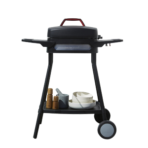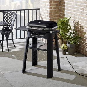 Elektrický gril Lumin Compact (Weber), 66 × 30,5 × 48,5 cm, skládací černý stojan, cena 13 290 Kč, www.pottenpannen.cz