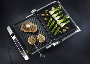 Profi Plus Grill (WMF), automatický snímač upravuje teplotu a dobu grilování podle velikosti a tloušťky masa, cena 7 299 Kč, www.wmf.cz