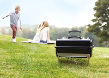 Gril na dřevěné uhlí Go Anywhere (Weber), grilovací plocha 41 × 25 cm, pochromovaný grilovací rošt, cena 2 999 Kč, www.pottenpannen.cz