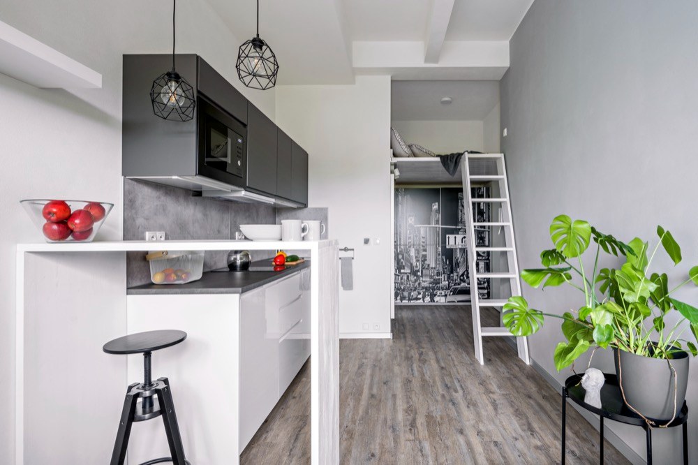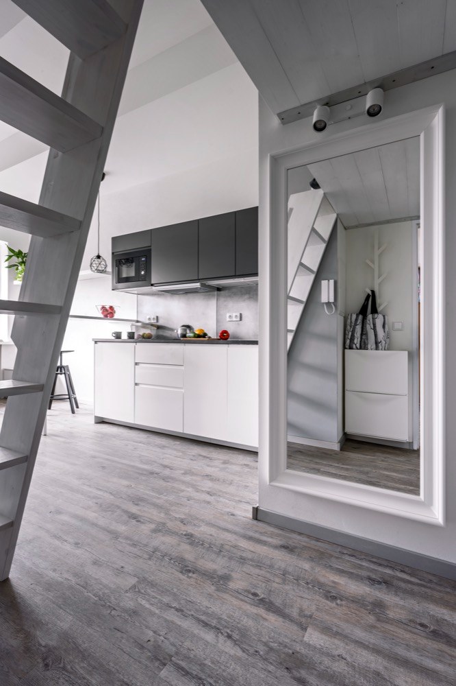 Aby byl byt co nejvíce světlý a svěží, nábytek i výmalba jsou v bílých a světle šedých tónech. Podlaha je v imitaci světlého dřeva. Originálním prvkem je černobílá komiksová tapeta, která kryje posuvné dveře do skříně pod spacím patrem. Hezkými oživujícími detaily jsou černá drátěná svítidla nad barem, barové stoličky a odkládací stolek.