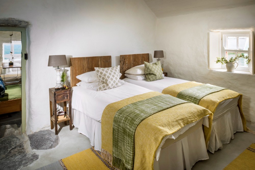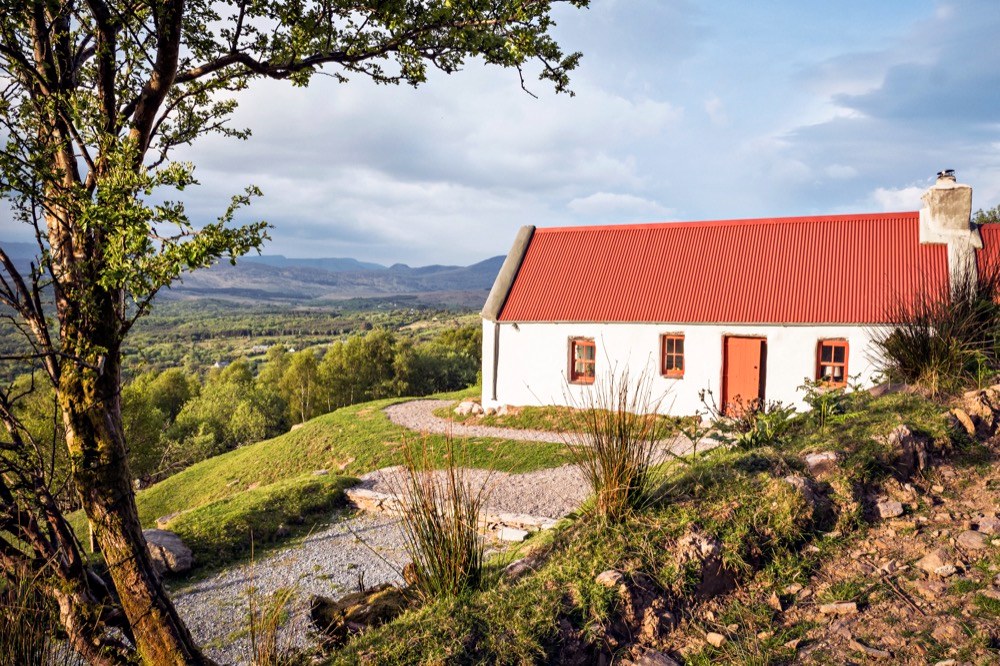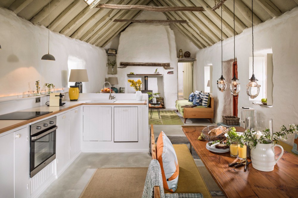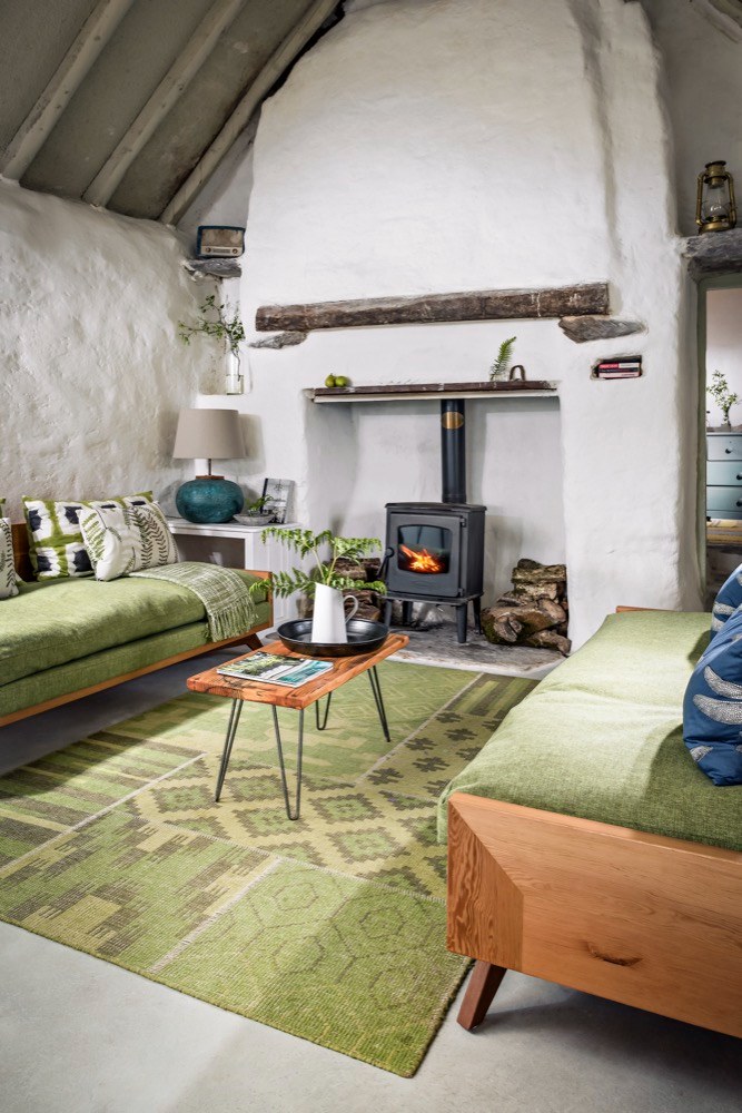 Pro zachování autenticity byly při rekonstrukci uplatněny výhradně místní materiály. Na litou betonovou konstrukci použili oxidovaný beton s dřevitou strukturou, jehož žlutohnědý odstín dokonale splývá s okolní krajinou. Modřínové trámy vytěžené z lesa nahradily původní už tlející trámy, kameny z pole posloužily k opravě rozpadajících se zdí a nábytek v celé chatě je vyrobený z místní borovice douglasky. Původní doškovou střechu nahradil vlnitý plech s charakteristickou červenou barvou. Koupelna se zapuštěnou vanou má přes boky nanesenou stejnou vápennou omítku, jakou použili na omítnutí všech vnitřních stěn. Denní světlo v koupelně zajišťují jakési světlíky ve stropě, z nichž jeden je umístěný přímo nad vanou, a nabízí tak relax pod hvězdami. Z koupelny se vchází přímo do nově přistavěné ložnice. Na chatu trochu neobvyklé uspořádání, které ale funguje dokonale. Výsledkem přestavby je okouzlující a vzdušné útočiště, jež si můžete pronajmout a užít si neopakovatelné chvíle v nádherné irské krajině.